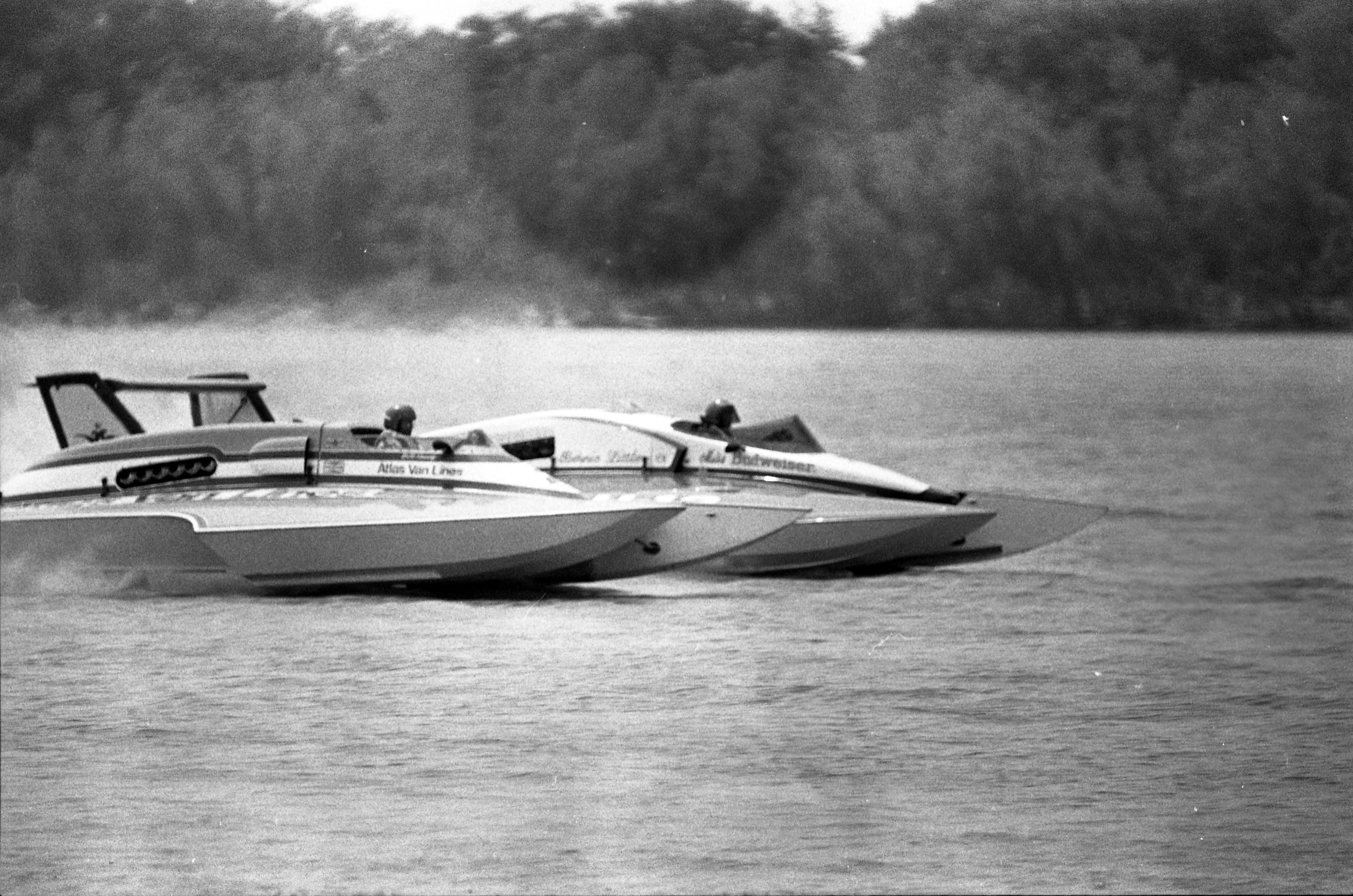 Thunder on the Ohio hydroplane races. Atlas Van Lines boat, driven by Bill Muncey, and the Budweiser boat, driven by Dean Chenoweth, neck and neck. The Budweiser boat was the ultimate winner.