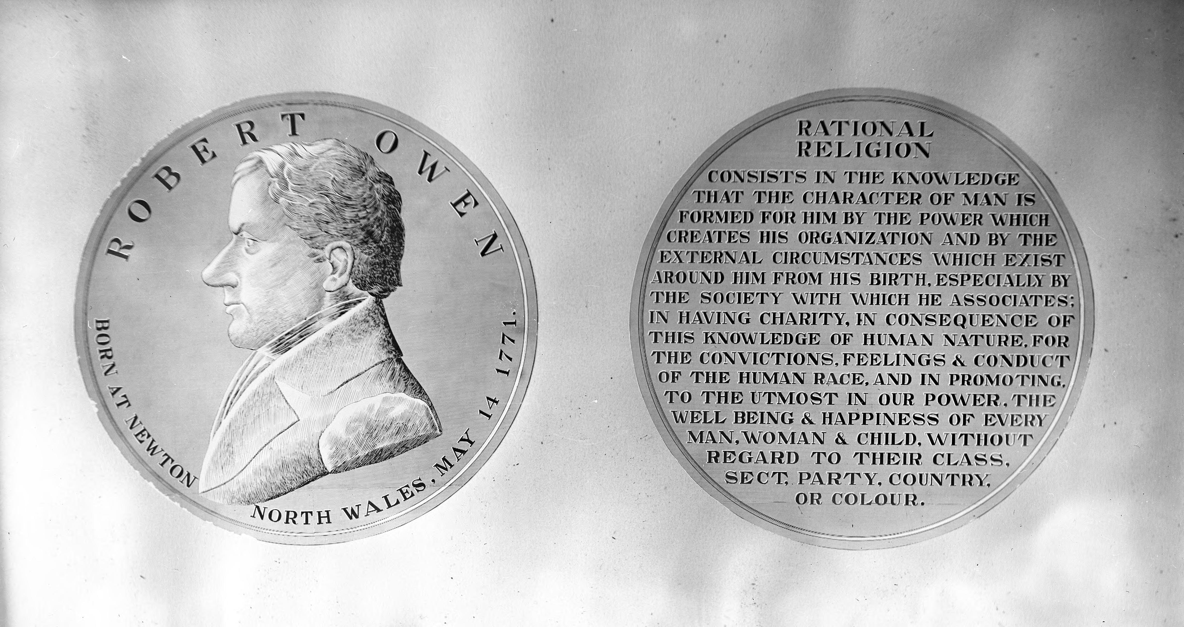 Robert Owen medallion and creed. The obverse carries a likeness of Owen, with the words,""Robert Owen born at Newton North Wales, Mary 14 1771." The reverse has this text:""Rational religion consists in the knowledge that the character of man is formed for him by the power which creates his organization and by the external circumstances which exist around him from his birth, especially by the society with which he associates; in having charity, in consequence of this knowledge of human nature, for the convictions, feelings & conduct of the human race, and in promoting, to the utmost in our power, the well being & happiness of every man, woman & child, without regard to their class, sect, party, country, or colour."