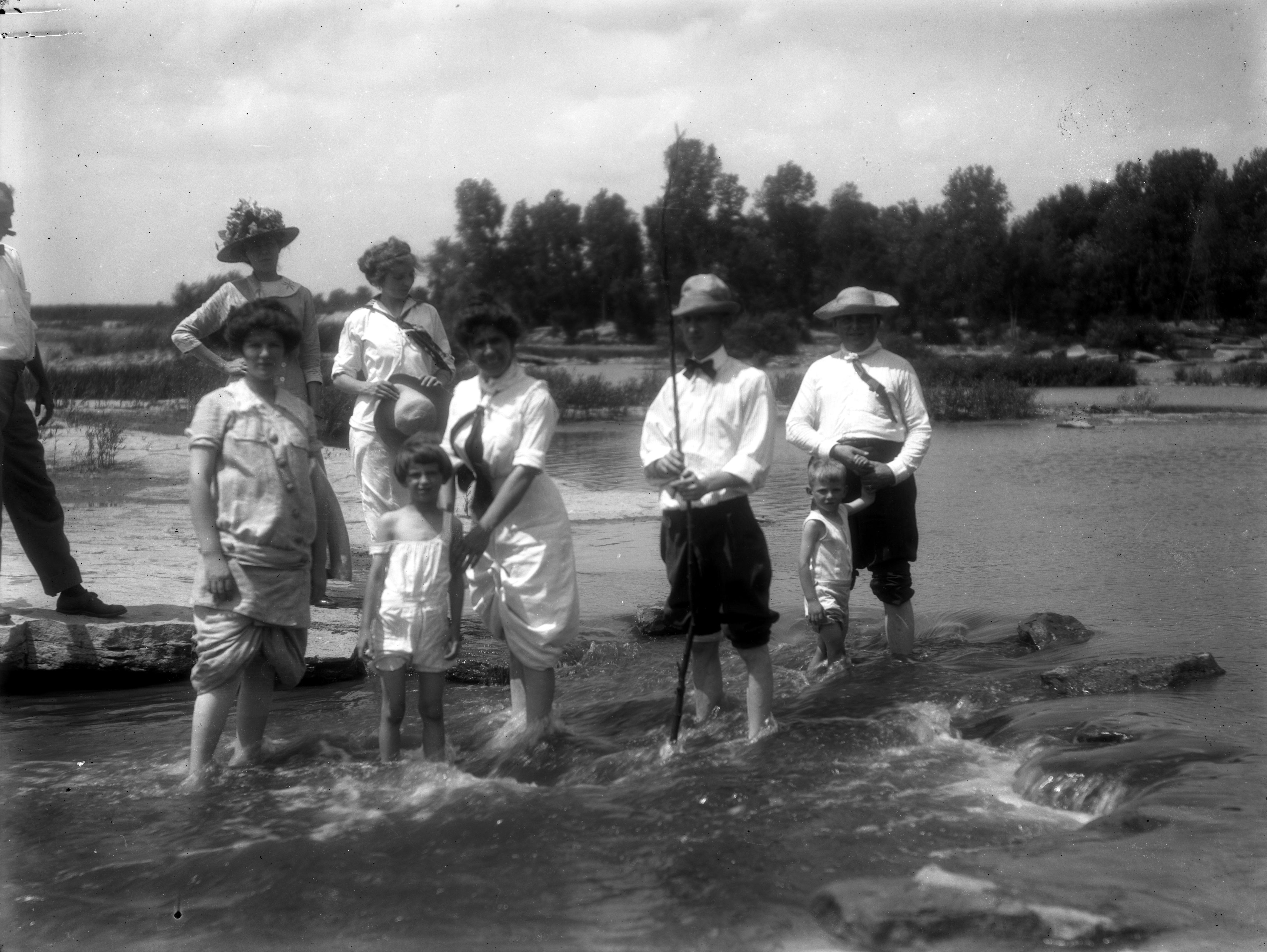 Embree family (4 women, 3 men, 1 young girl, 1 little boy) wading at the old dam on the Wabash River.""The Old Dam is a group of natural rock formations rising from the bed of the Wabash River near New Harmony. When the Wabash is low in Summer, the rocks emerge forming a series of rapids, pools, and waterfalls." (http://visitposeycounty.com/the-old-dam/).