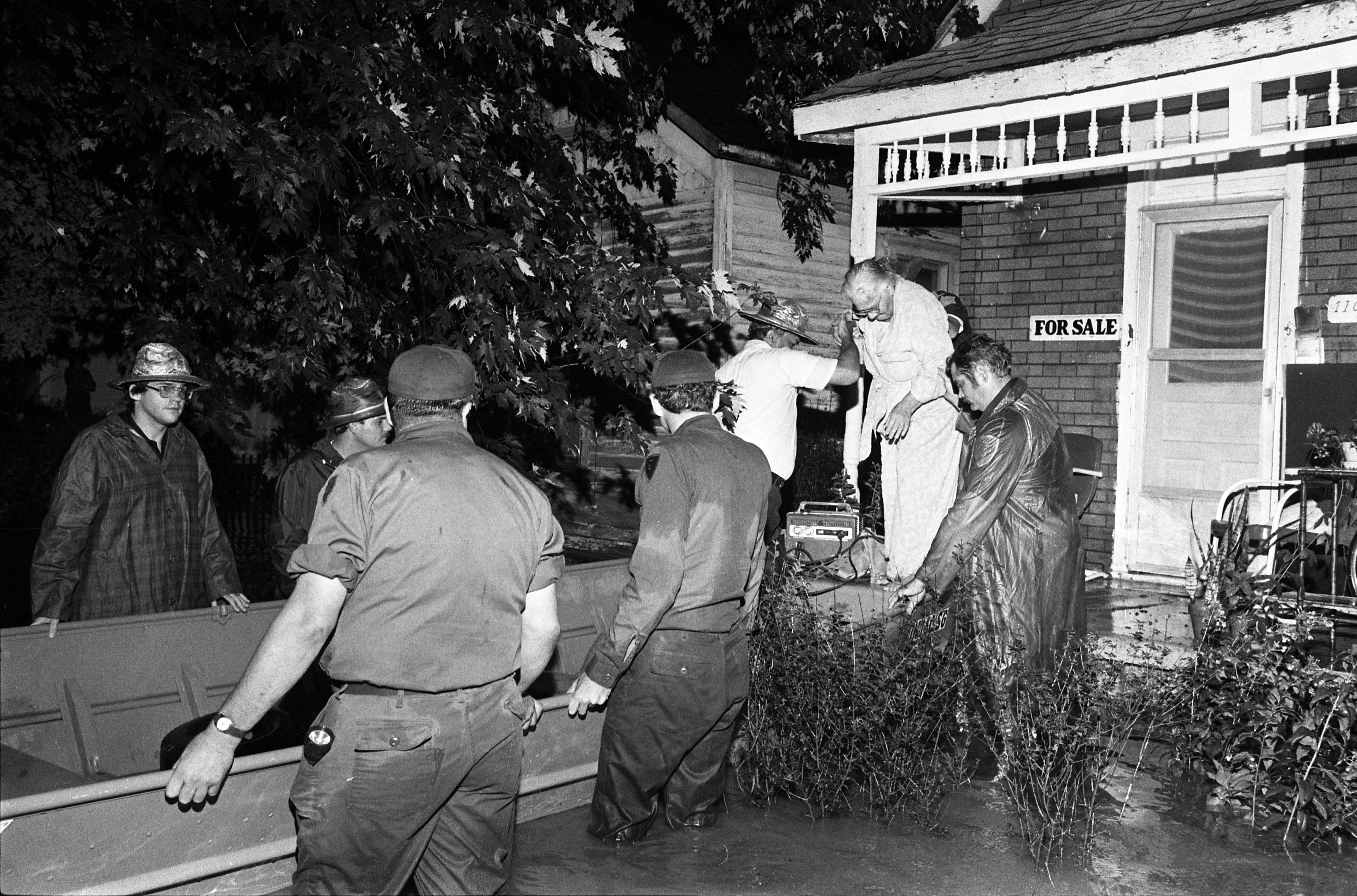 This photograph depicts the rescue of 83 year old Mrs. Myrtle Grubb from her porch on the south side of Princeton, IN by Gibson County sheriff's deputy Nick Michas. Torrential rains brought 8.9 inches of rain to Princeton over a 48 hour period, and 14.9 inches to English and Marengo, other small southern Indiana towns, causing rapid flooding. Up to 11 counties were considered disaster areas.