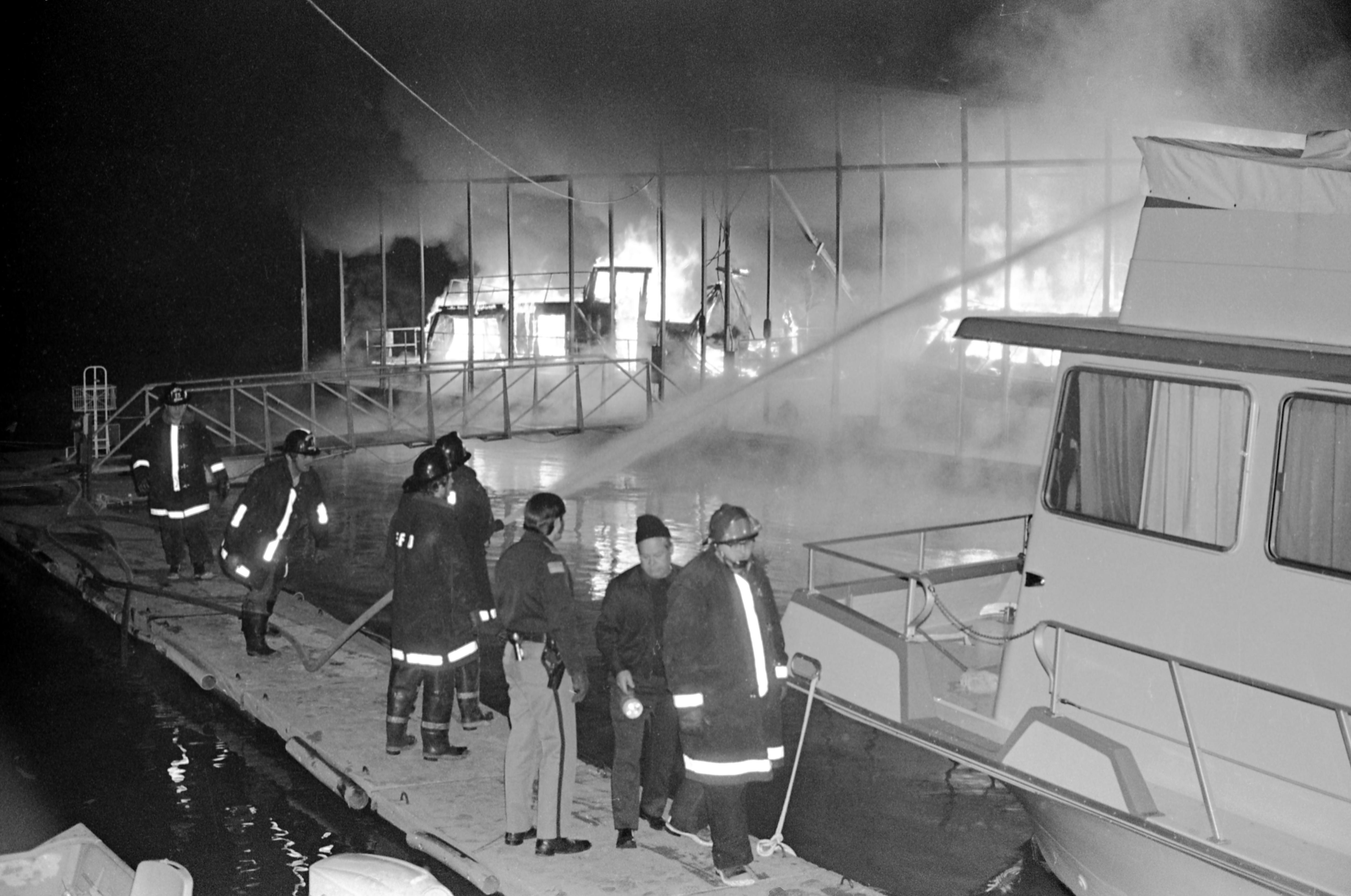 Firemen standing on the floating docks by a boat and spraying water on the fire. The December 23.1975 fire at Inland Marina on Waterworks Rd. left an estimated $850,000 worth of pleasure boats in ruin. This photograph was in the December 23, 1975 edition of the Evansville Press, with this caption:""Firemen watched helplessly as flames spread through 19 boats at Inland Marina."