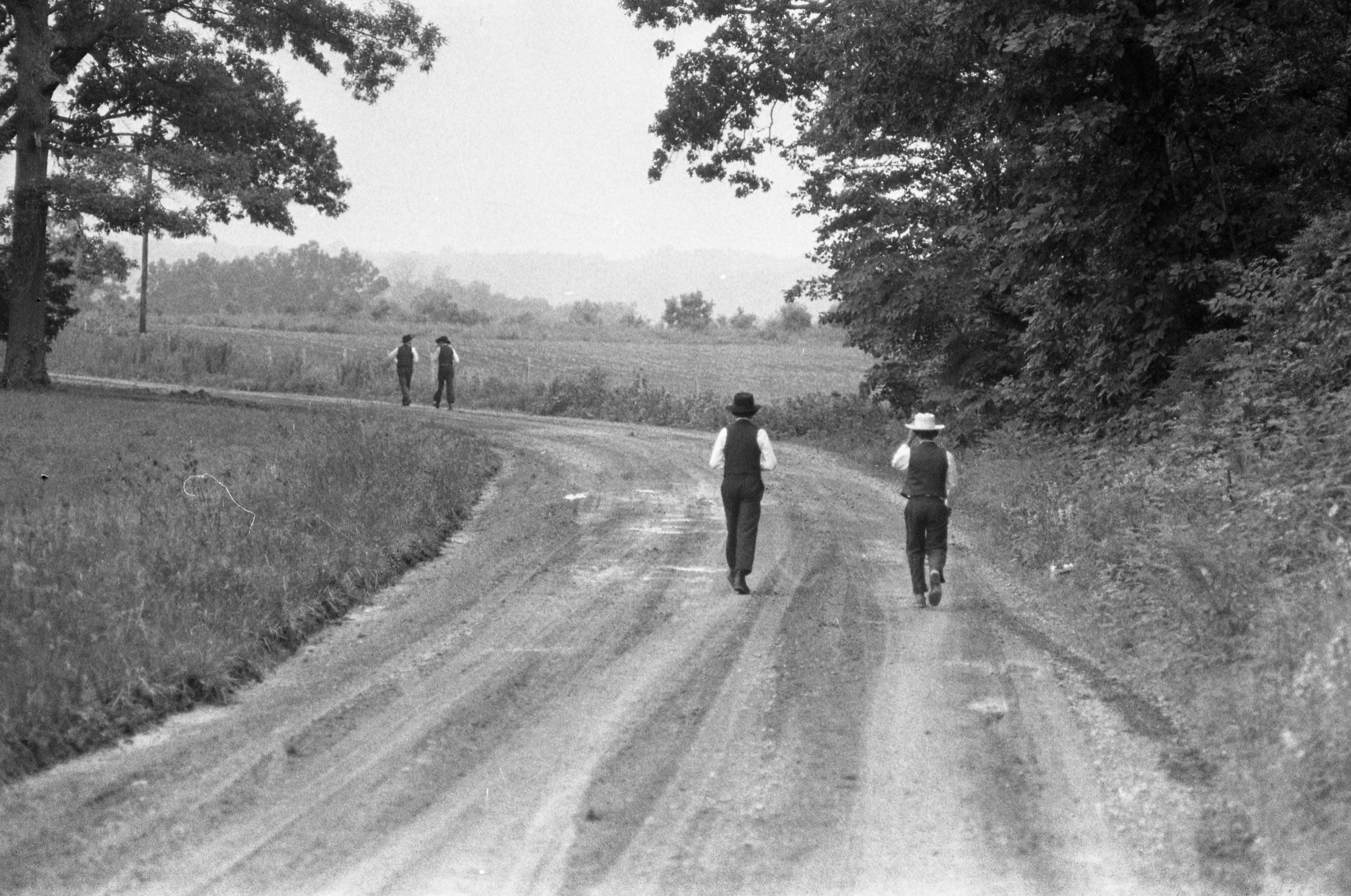 Looking from the back at 4 Amish boys walking down a dirt road. These boys are wearing shoes.