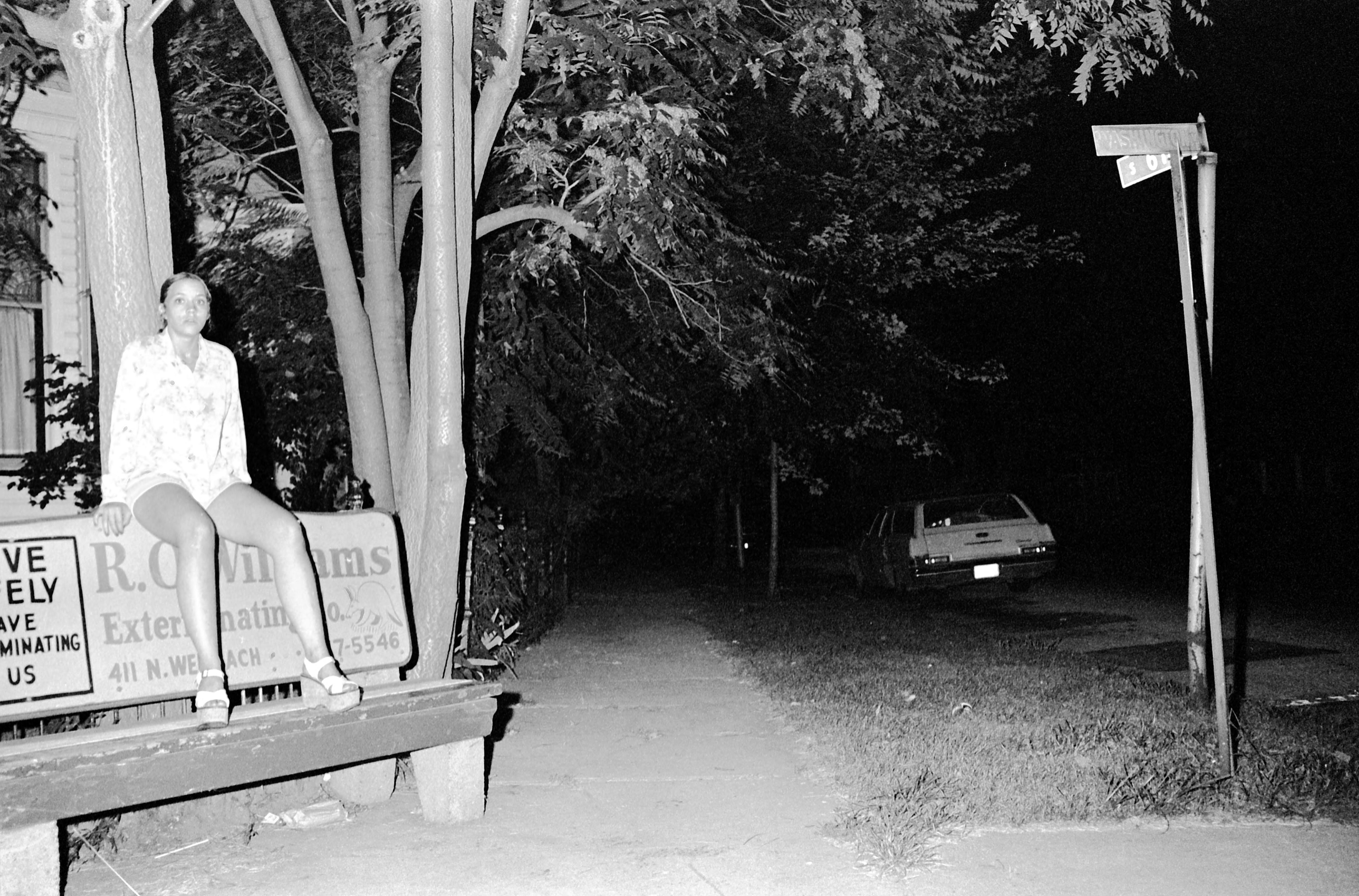 Young woman sitting on the back of a bench at the corner of S. 6th St. and Washington Ave. The bench is advertising R.O. Williams Pest Control Corp. at 411 N. Weinbach Ave., in addition to another company which is only partially visible.