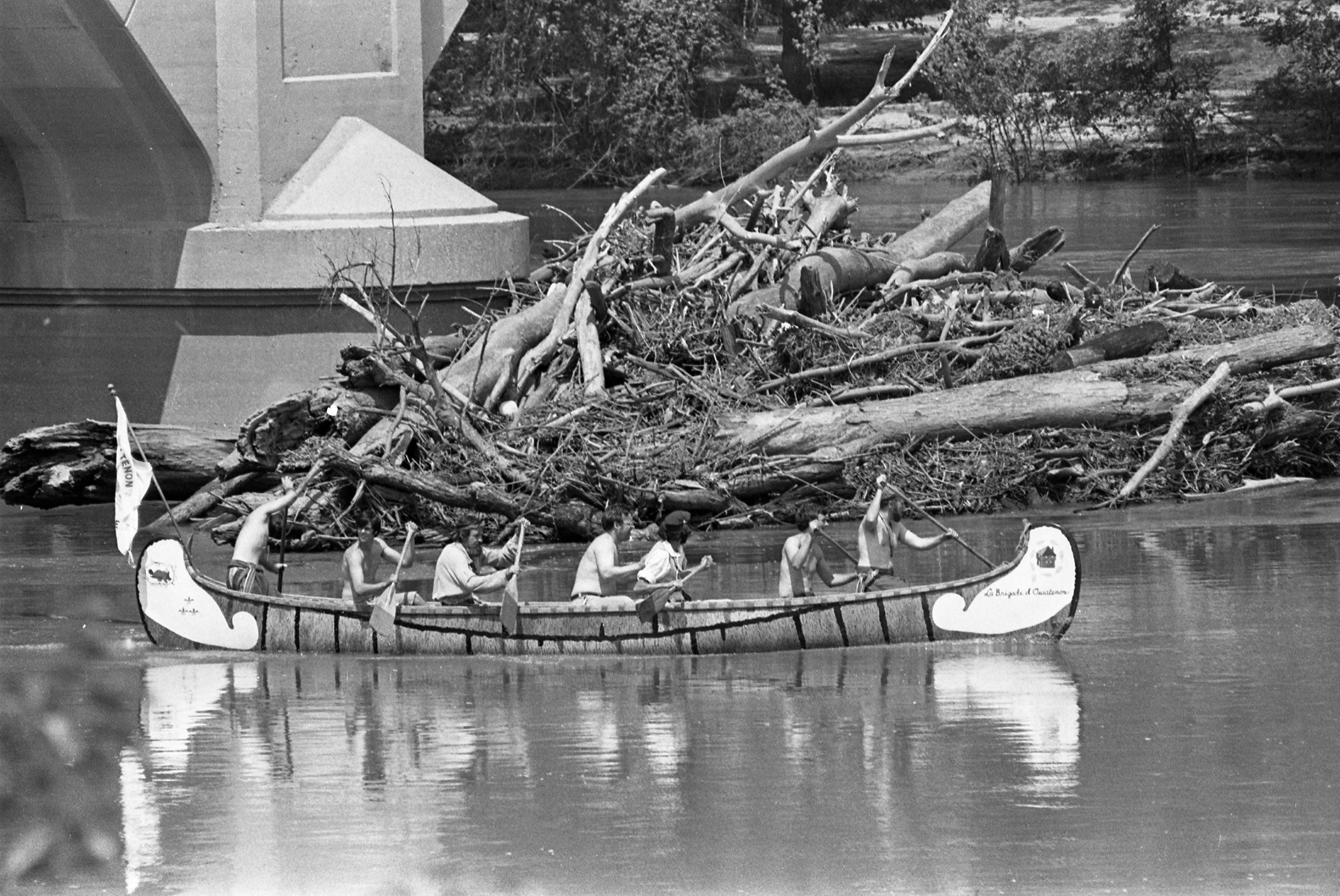 One of the replica canoes on the Wabash River, in celebration of the Spirit of Vincennes Rendezvous. This canoe bears the name of La Brigade d'Ouiatenon. Fort Ouiatenon was a French trading post near W. Lafayette, IN, also on/near the Wabash River.