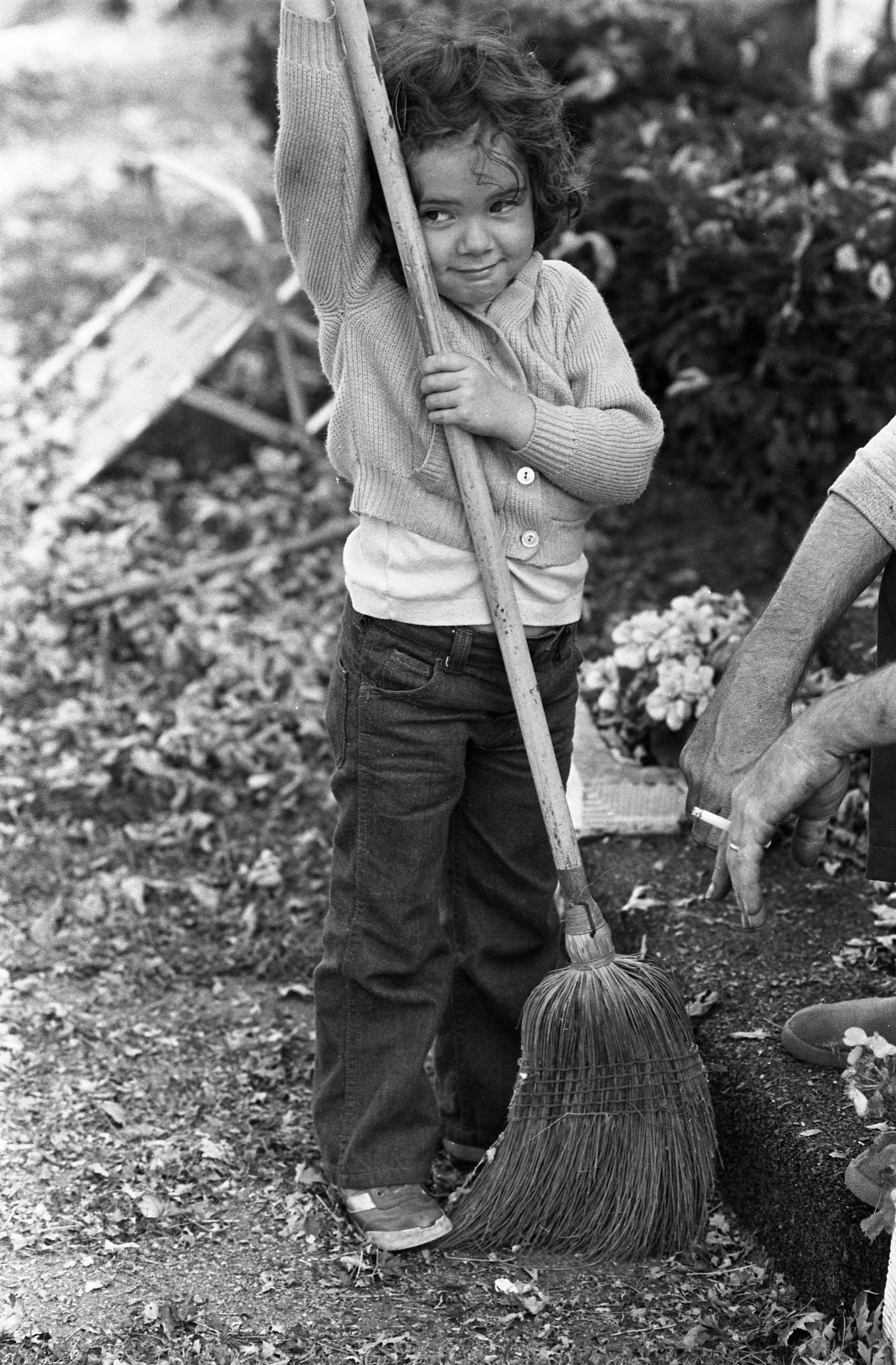 Little girl holding a broom--next to her are the arms and feet of an adult man working near here, smoking a cigarette