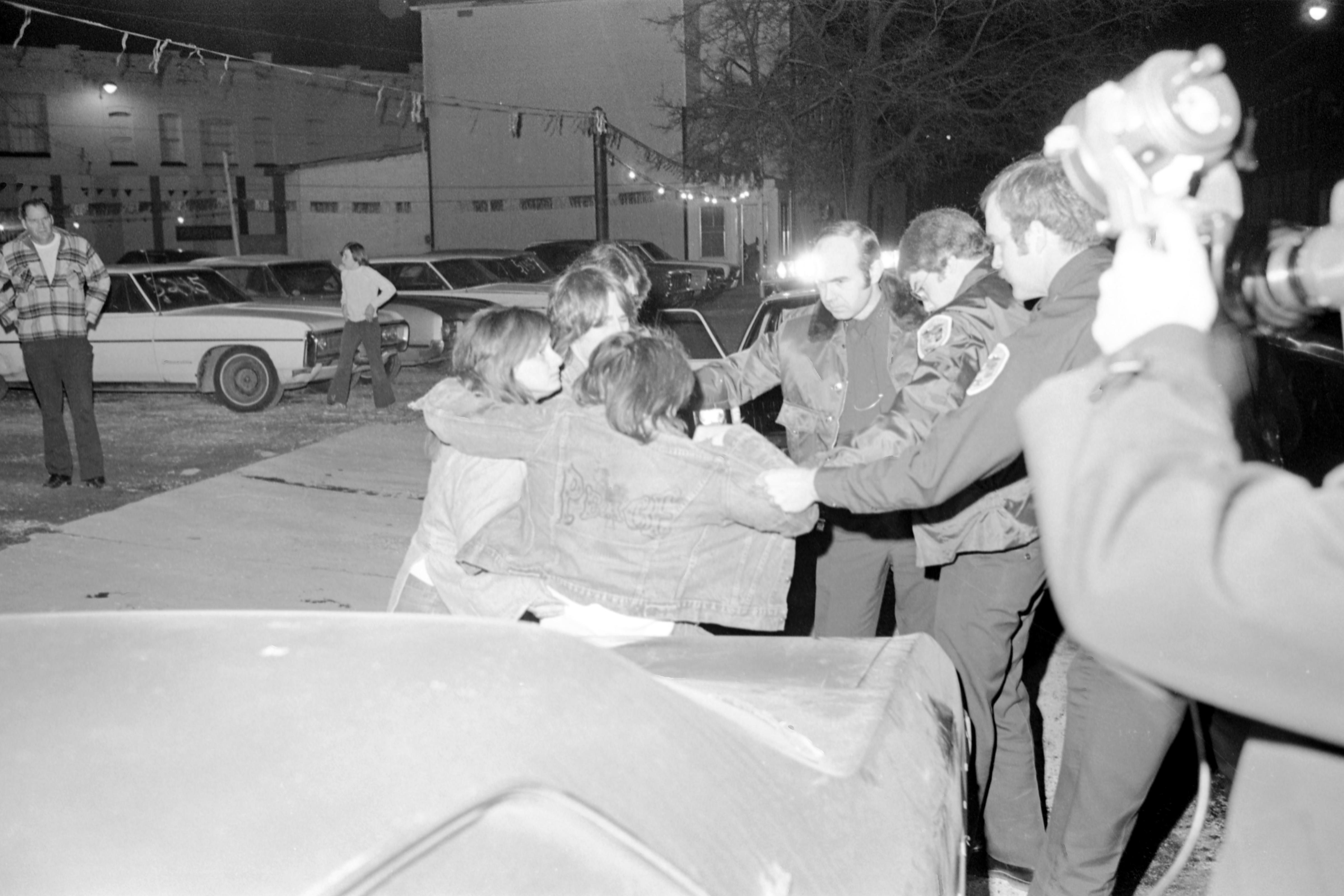 Police talking to/confronting a group of teenagers in front of a used car lot, while a man with a camera is in the foreground