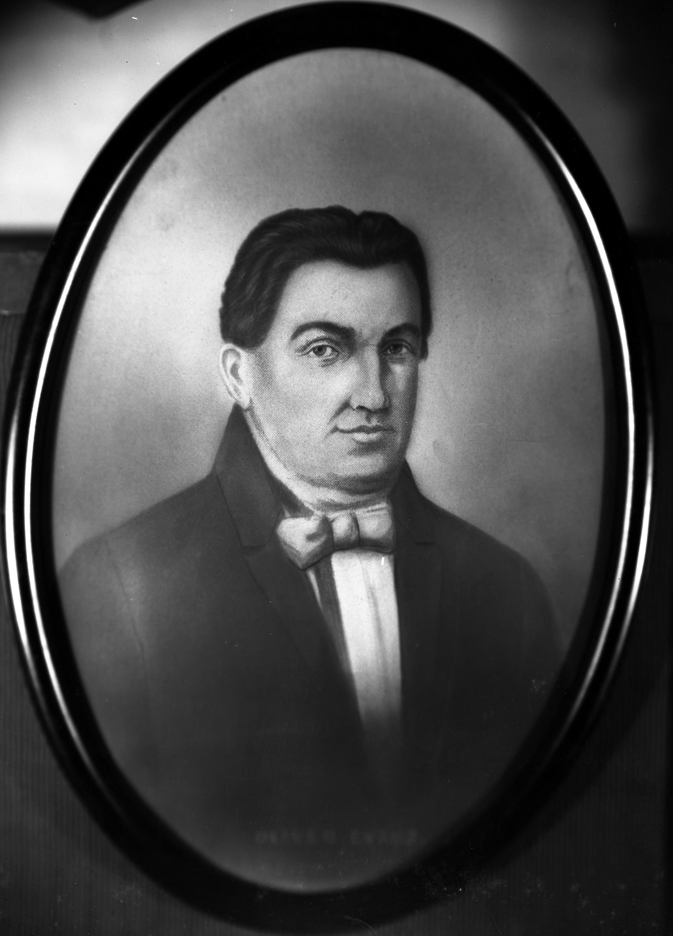 Portrait of Oliver Evans. There are 2 possible identifications for this man. Oliver Evans (1755-1819) was an inventor whose greatest contribution was the high pressure steam engine. He was born in Delaware and died in New York. (http://www.pbs.org/wgbh/theymadeamerica/whomade/evans_hi.html) Alternatively, it could be Oliver Evans, Jr.""The names of New Harmony's star-studded scientists are well known; those of her inventors, rather less so: Oliver Evans, Jr., and Robert Henry Fauntleroy, to name just two. Evans and Fauntleroy were contemporaries; they were both married to women of distinguished ancestry and distantly related to each other through these marriages. They lived successively in the same house (at Evans' death Fauntleroy purchased the Harmonist frame building). They apparently worked together, for the designs and drawings of Evans ultimately became the possessions of Fauntleroy in whose personal papers they survived. Evans, youngest son of the inventor of high pressure engines, steam carriages, and milling systems, was influenced by the rich heritage of his father. He married Louisa, the eldest daughter of Joseph Neef, in 1827 and came to live in New Harmony. There he taught in the Owen Community schools, joined the Education Society, began operation of an iron foundry, manufactured cast plows, operated a sawmill, set up a grist mill to make use of his steam engine, and farmed." (https://scholarworks.iu.edu/journals/index.php/imh/article/view/10250/14211_1).