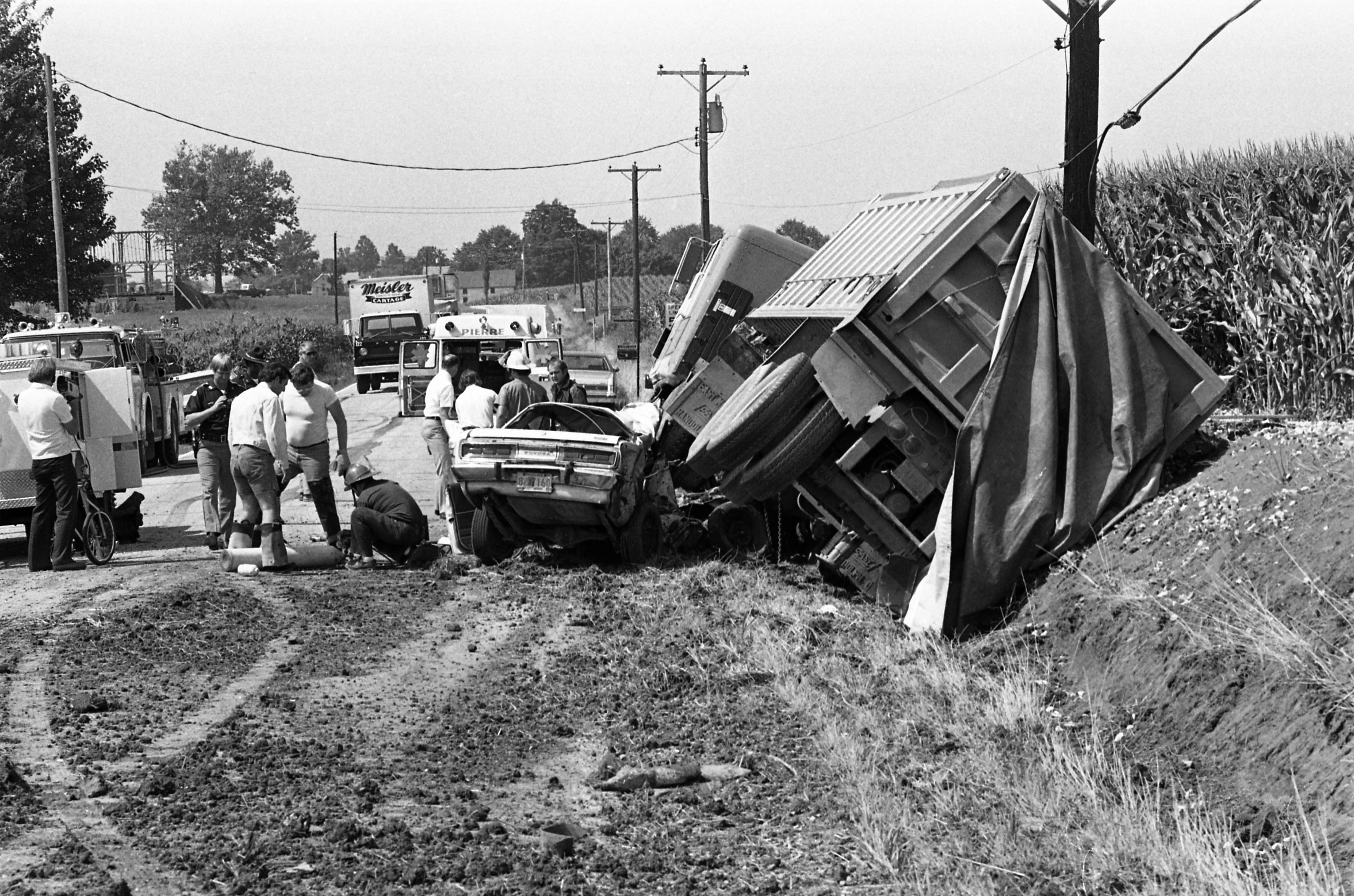 Car rammed into a dump truck, with lots of personnel on the scene, including a Pierre ambulance