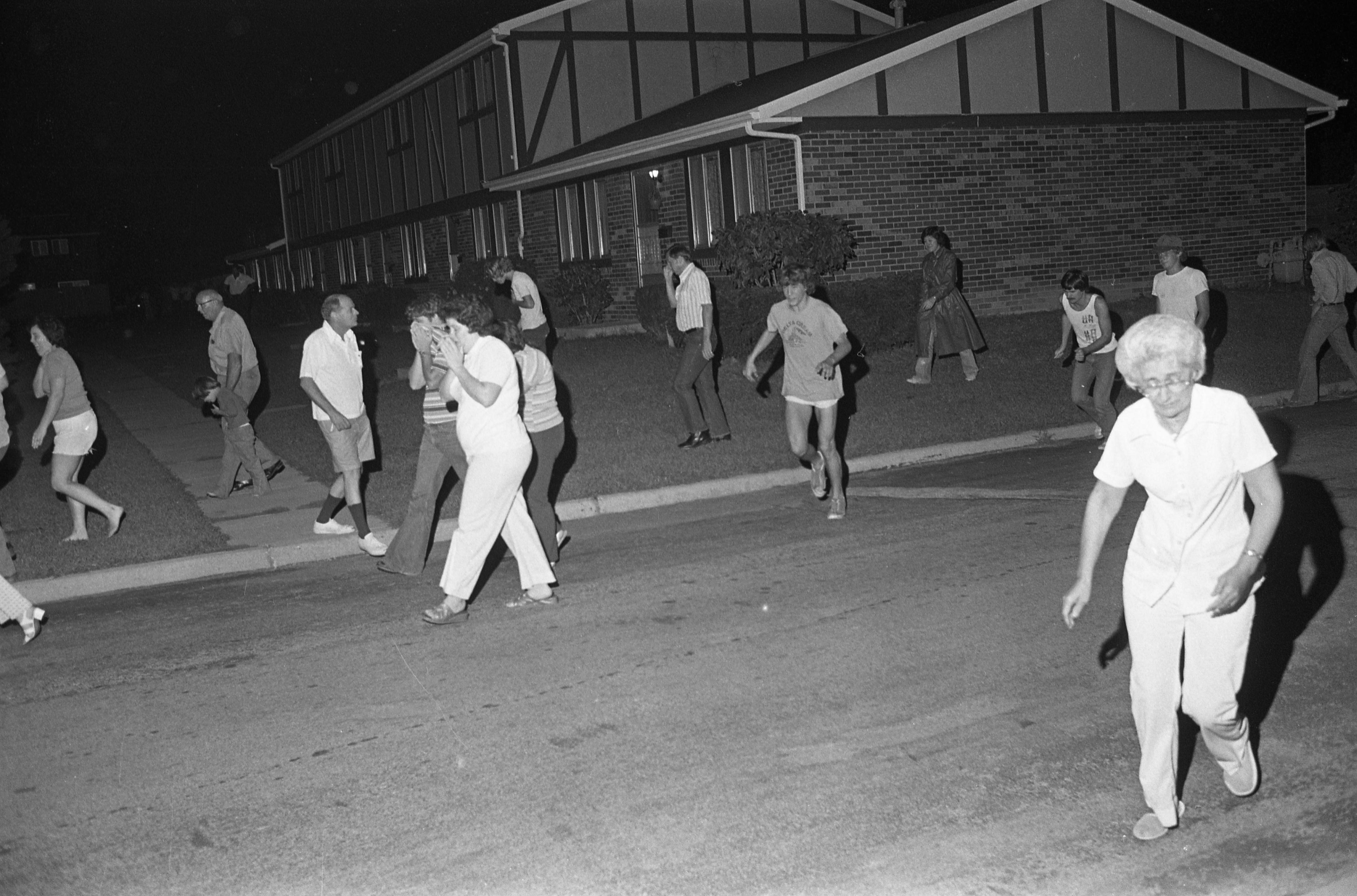 People evacuating an unidentified apartment complex, here trying to escape from tear gas. The cause was a dispute between a man and his ex-wife that turned violent.