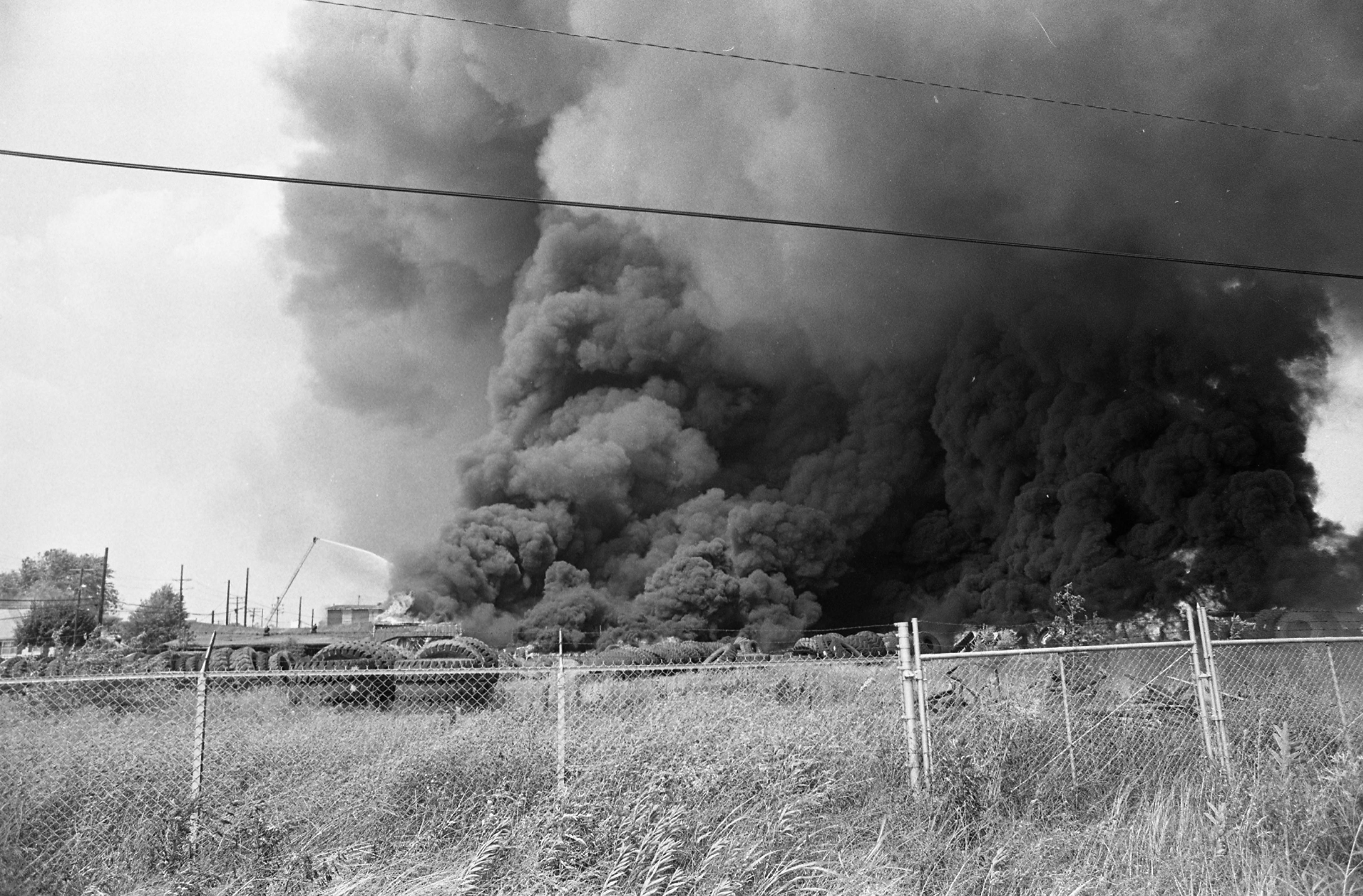 This fire began in the Atlas Tack building at the corner of O'Byrne and Atkinson St." then was blown across O'Byrne St. into an open field full of tires, and from there debris from the tires blew it back into warehouses at the corner of Clay and Atkinson St.. Here is seen the field full of tires, with smoking rising and the ladder truck in the background.