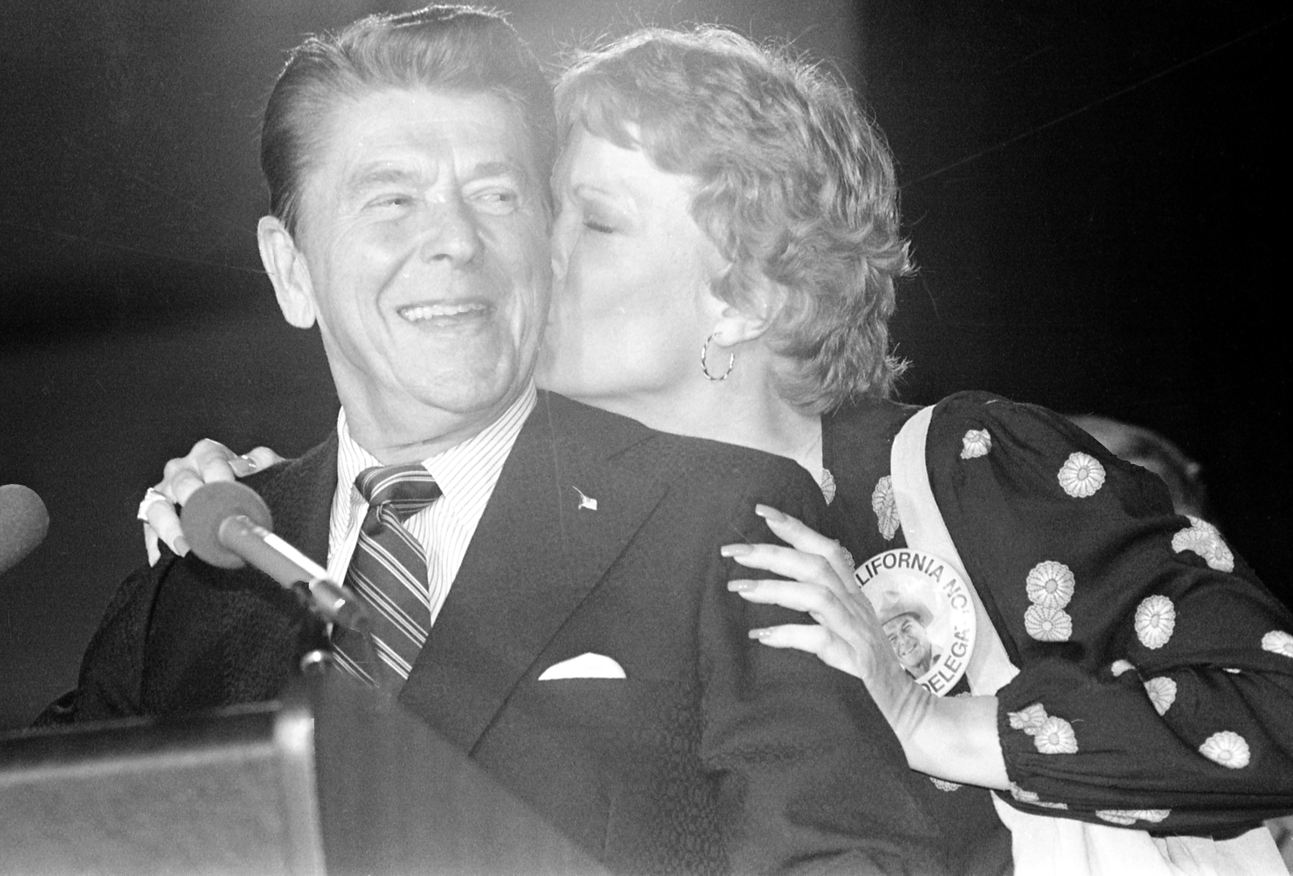 Ronald Reagan at the 1980 Republican National Convention, being kissed by daughter Maureen, a delegate from California