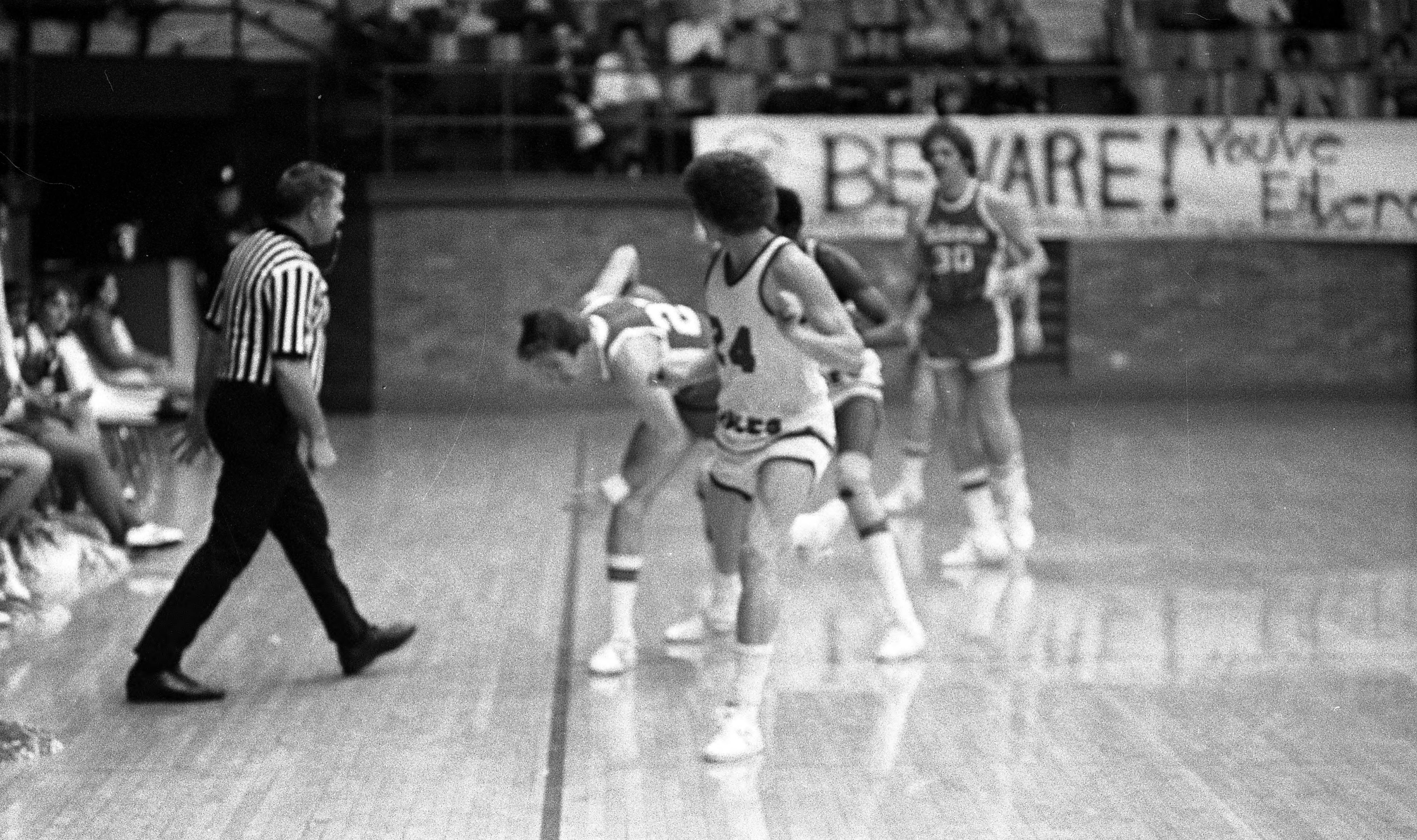 ISUE (Indiana State University Evansville, now USI/University of Southern Indiana) Eagles vs. Bellarmine University Knights. ISUE won, 88-84. Here the referee approaches no. 24 for the Eagles, Ken Mask.