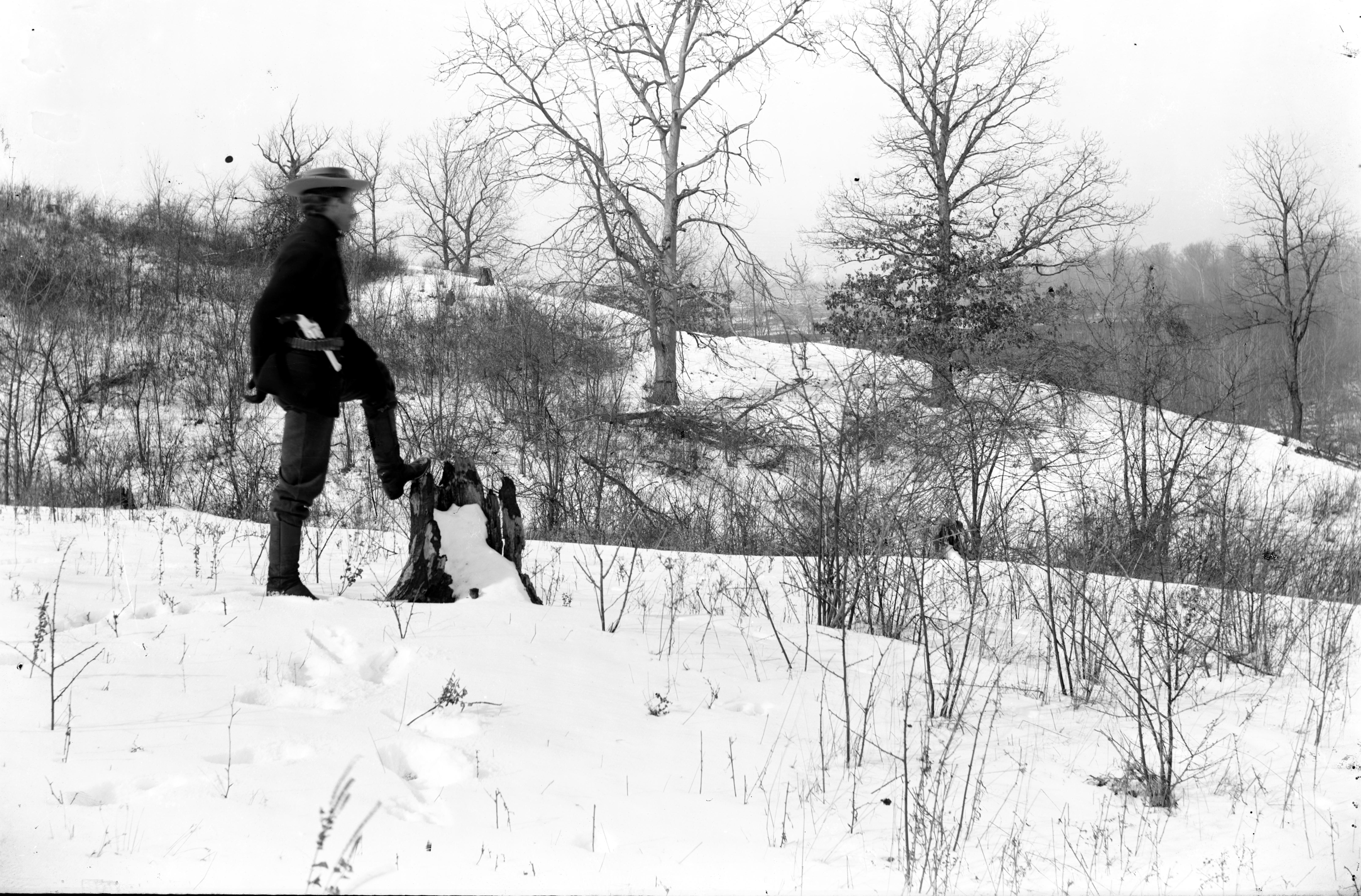 Man standing in snow-covered field, his foot upon a stump, with pistol and cartridges.