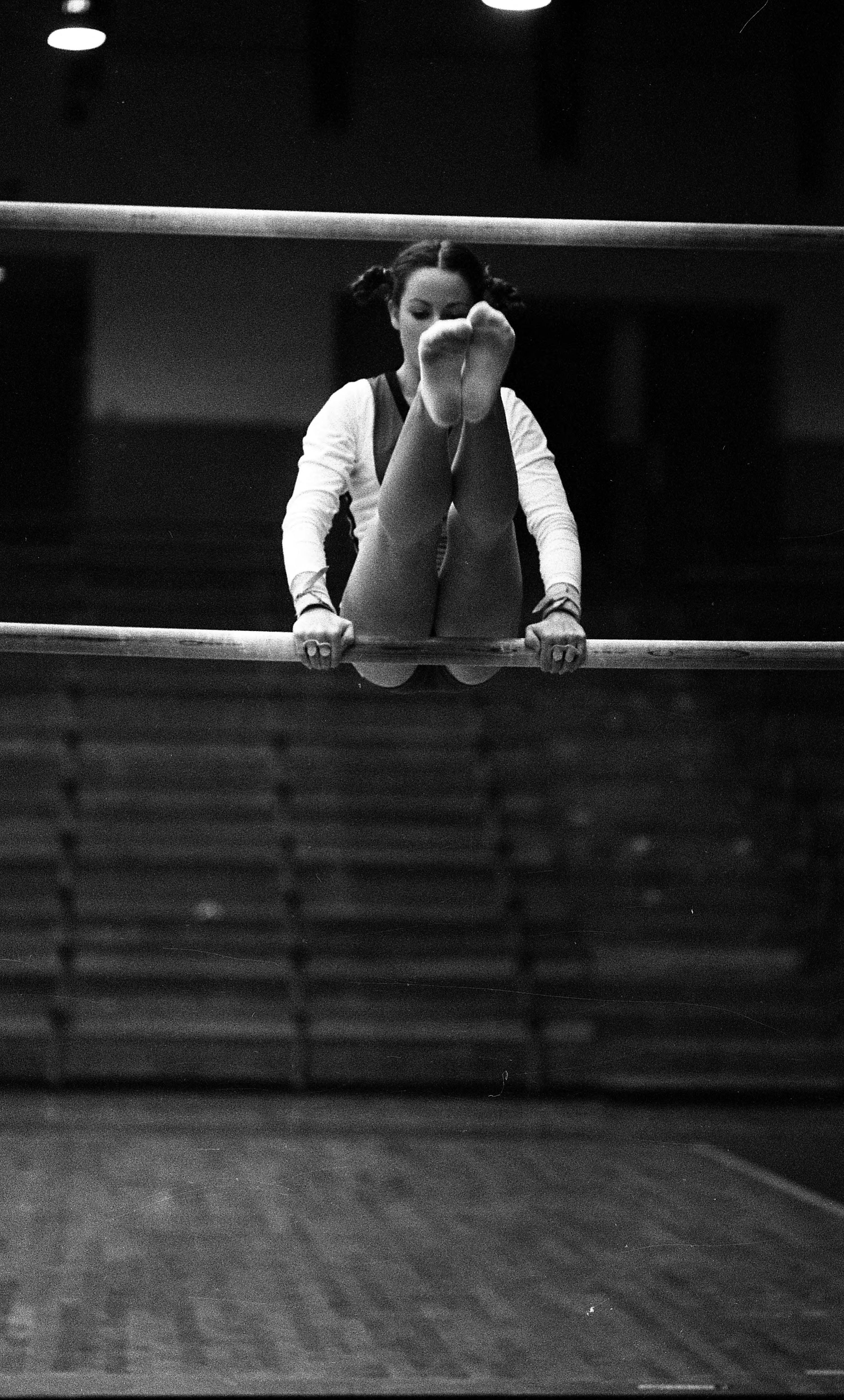 Gymnast sitting balanced on lower bar of uneven parallel bars, with her legs raised