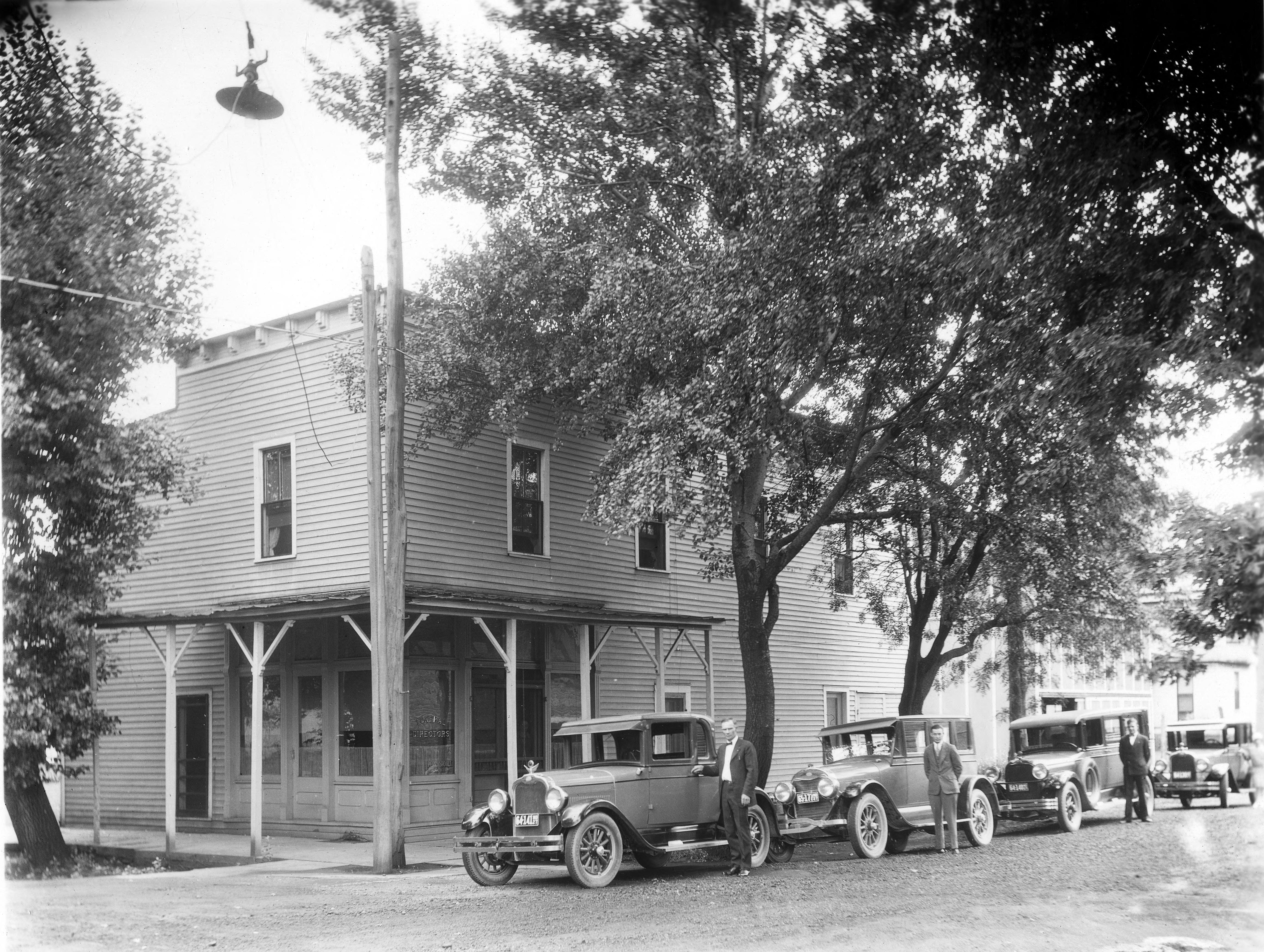 Shoultz Funeral Home, funeral director Perry Shoultz, with hearse and other cars lined up on the street. In 1950 another local funeral home, Werry, first partnered with and then bought out Shoultz, and built a new building at the corner of Brewery and Steam Mill Sts. Whether of not this is that location is unknown.