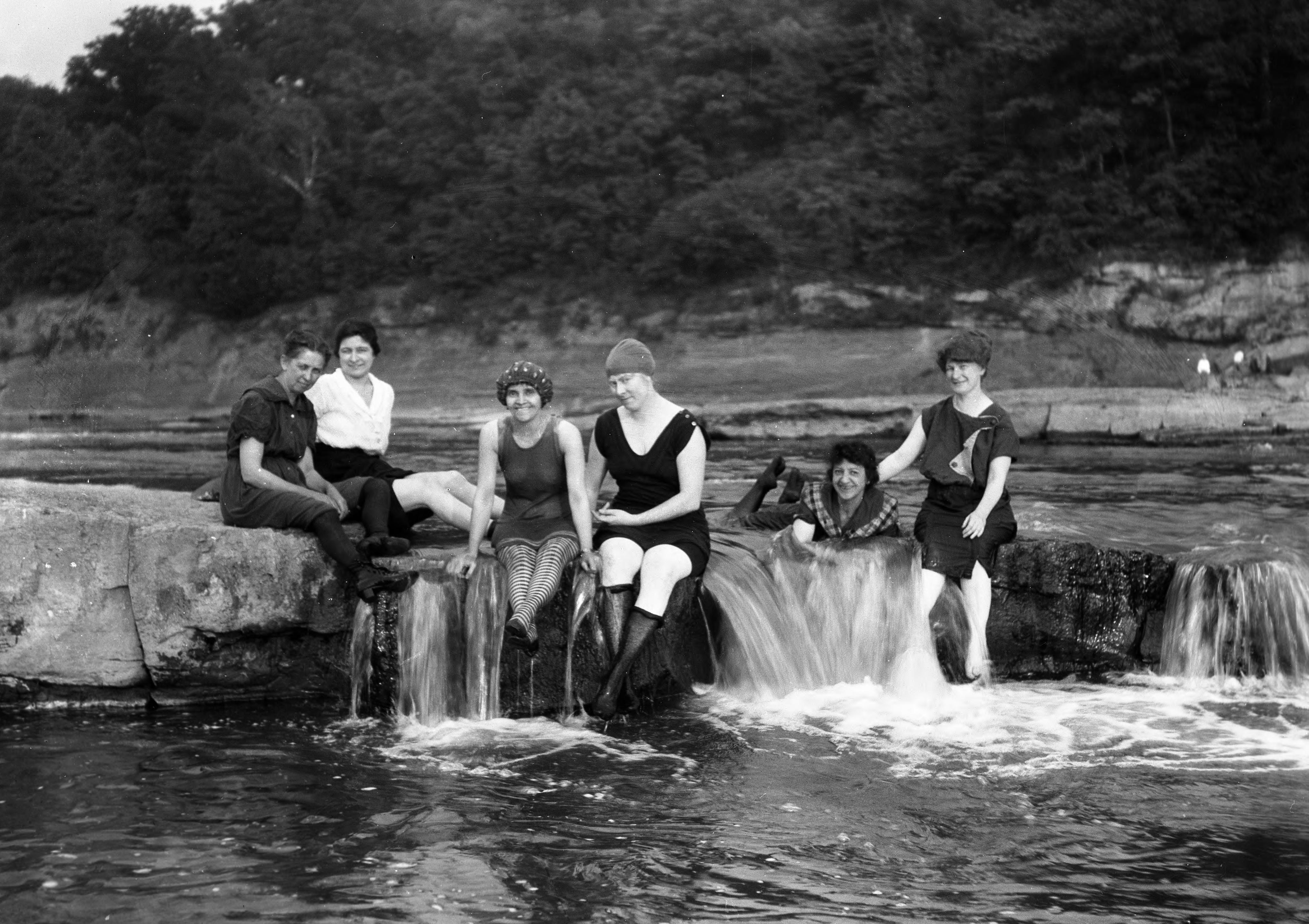 Group at old dam, sitting in falls, from left: Maud Miller Fauntleroy, Frances Stoker, Neva Watz Glump, Grace Alsop Schultz, Nellie Hargraves, and Louise Husband.""The Old Dam is a group of natural rock formations rising from the bed of the Wabash River near New Harmony. When the Wabash is low in Summer, the rocks emerge forming a series of rapids, pools, and waterfalls." (http://visitposeycounty.com/the-old-dam/).