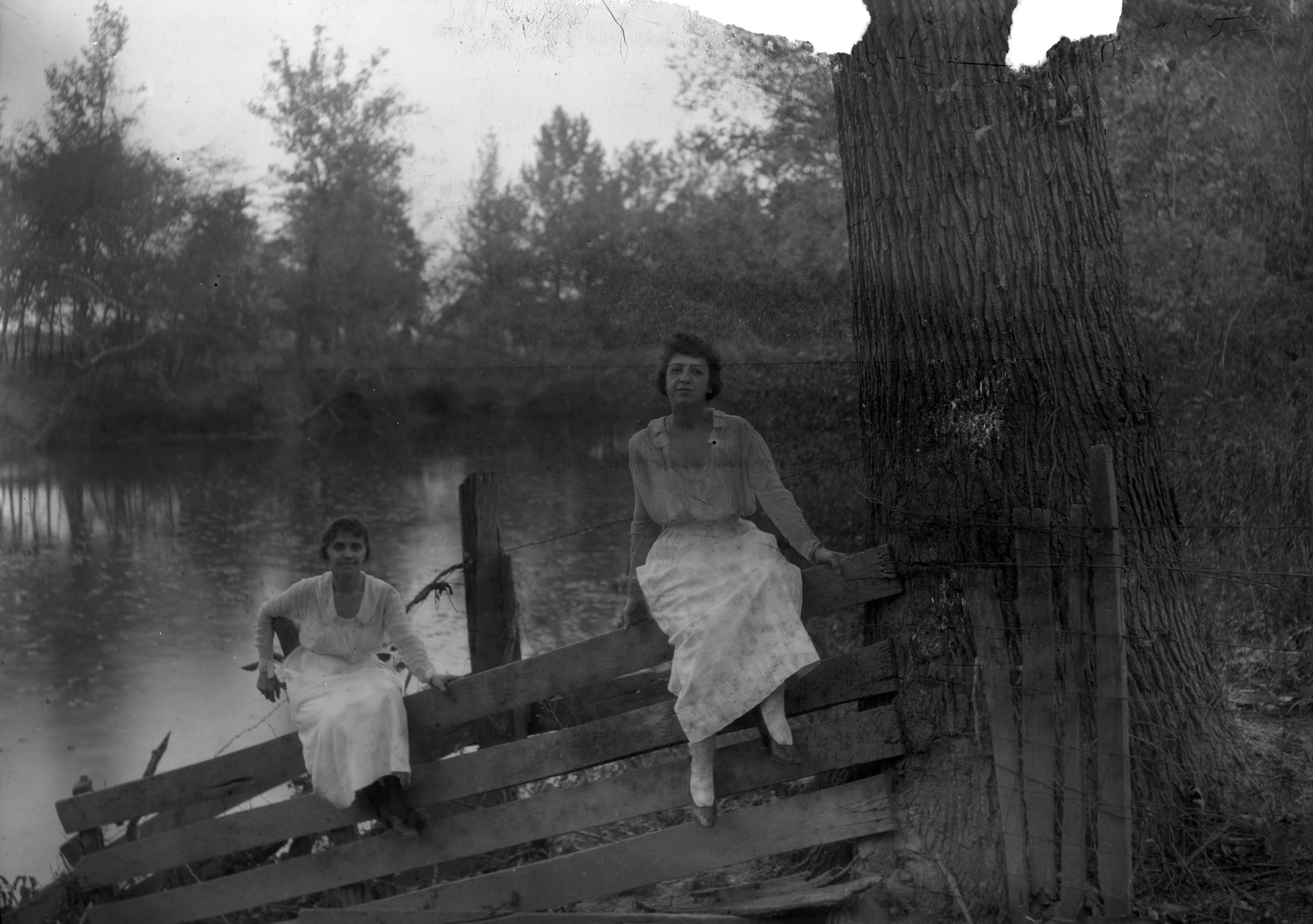 At the bayou, from left: Neva Glump and Nellie Hargraves, at the ferry. Bayou was one of the local terms used for some of the bottom lands of the Wabash River in this area.