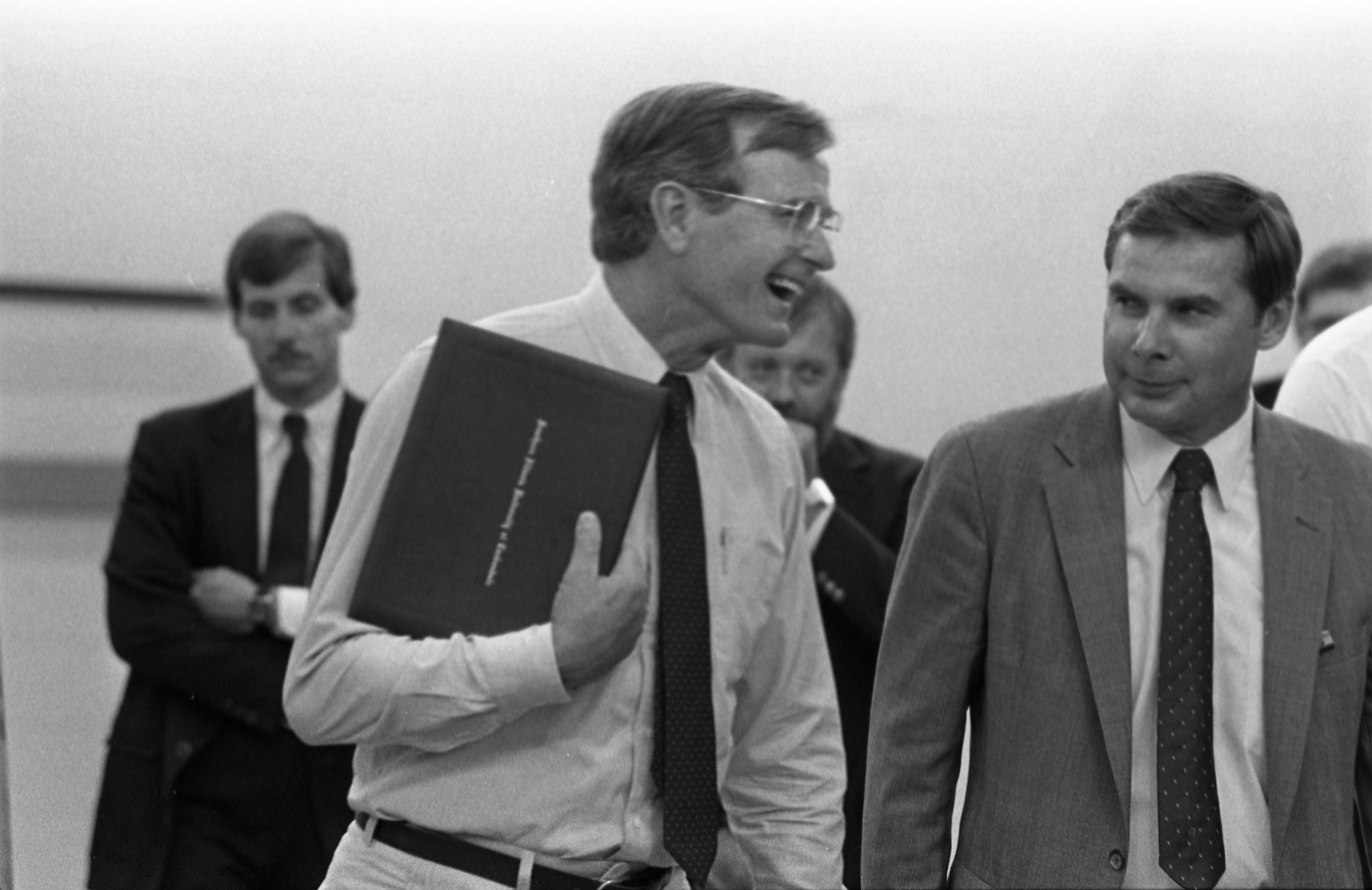 Vice President George Bush visited the Western Fuels Association Inc.'s Bushy Creek mine in Galatia, IL on September 25, 1984. On this trip he also stopped at Southern Illinois University Carbondale's Coal Research Center, shown here, with Bush laughing with the crowd and carrying what appears to be a diploma from Southern Illinois University at Carbondale.
