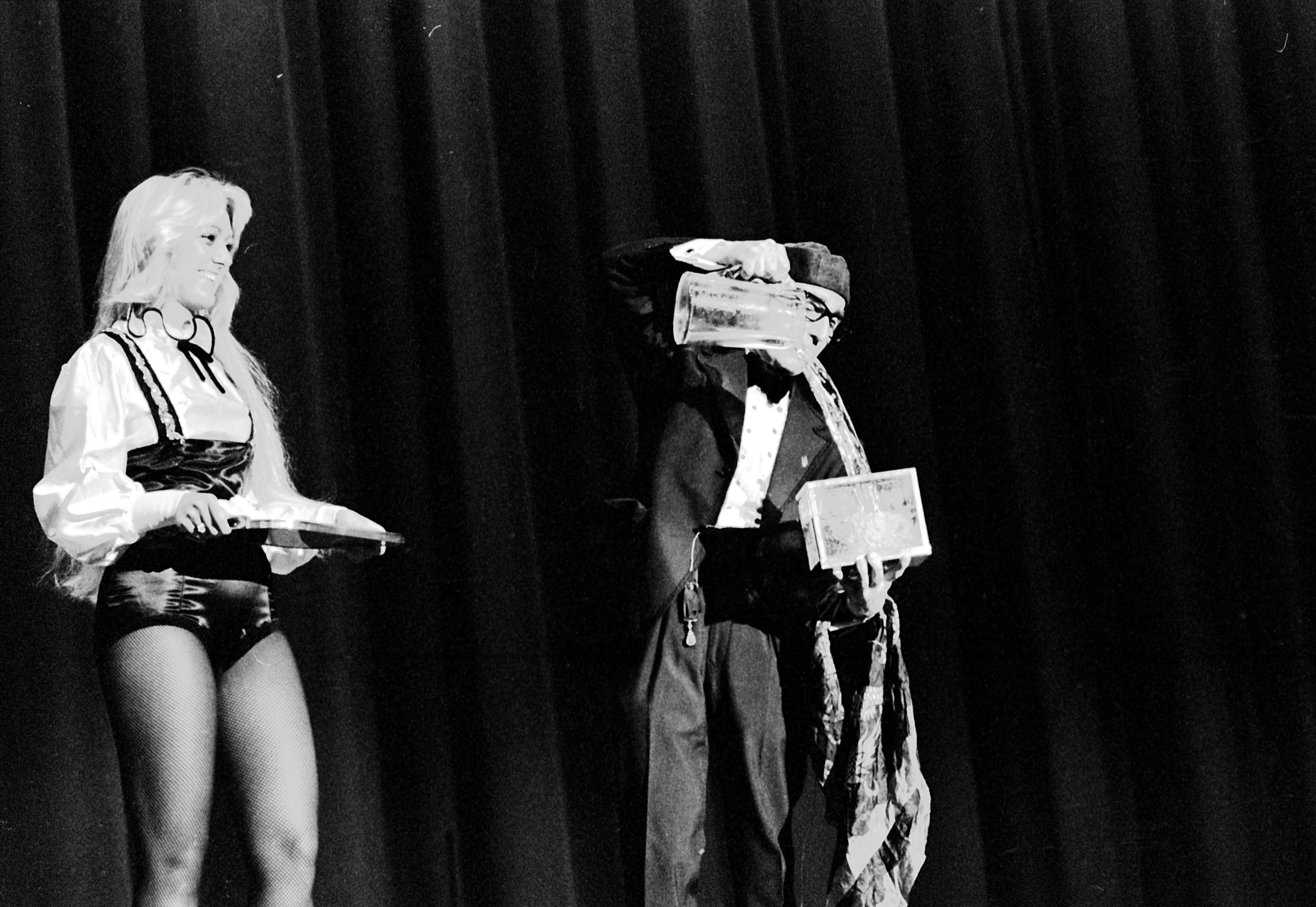 Magician pouring water into a clear box, while assistant watches