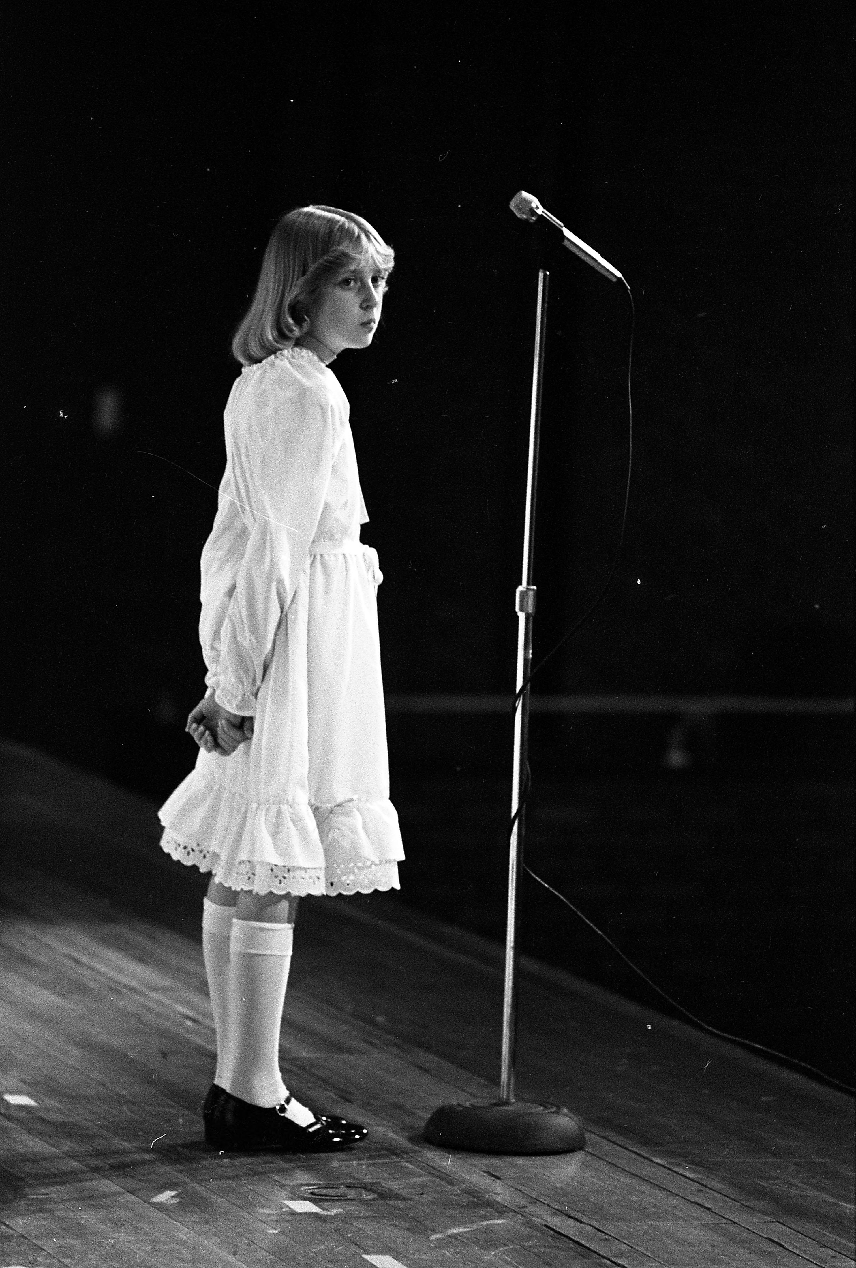 This photograph appeared in the April 28, 1979 edition of the Evansville Press. Pictured is Kristen Schroeder, a 10 year old student from Evansville Christian School, who properly spelled ""rissole"" to win the Tri-State Spelling Bee, held at Central High School, winning an all expenses paid 7 day trip to Washington, D.C. to compete in the national spelling bee.