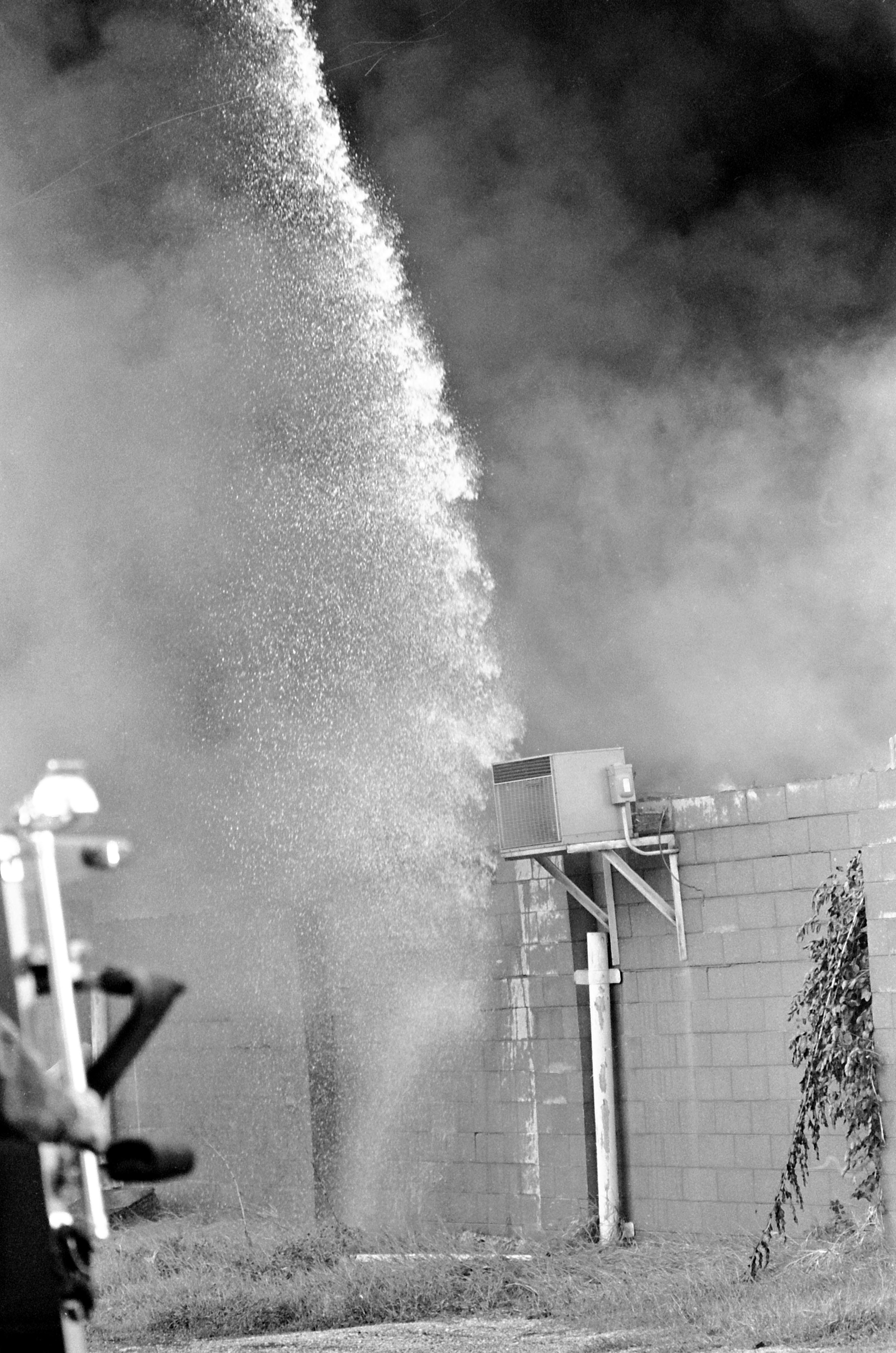 Evansville firefighters on the scene of a 3 alarm fire at A-W-D Inc. (auto parts) at 772 Division St. Water spraying on a fire.