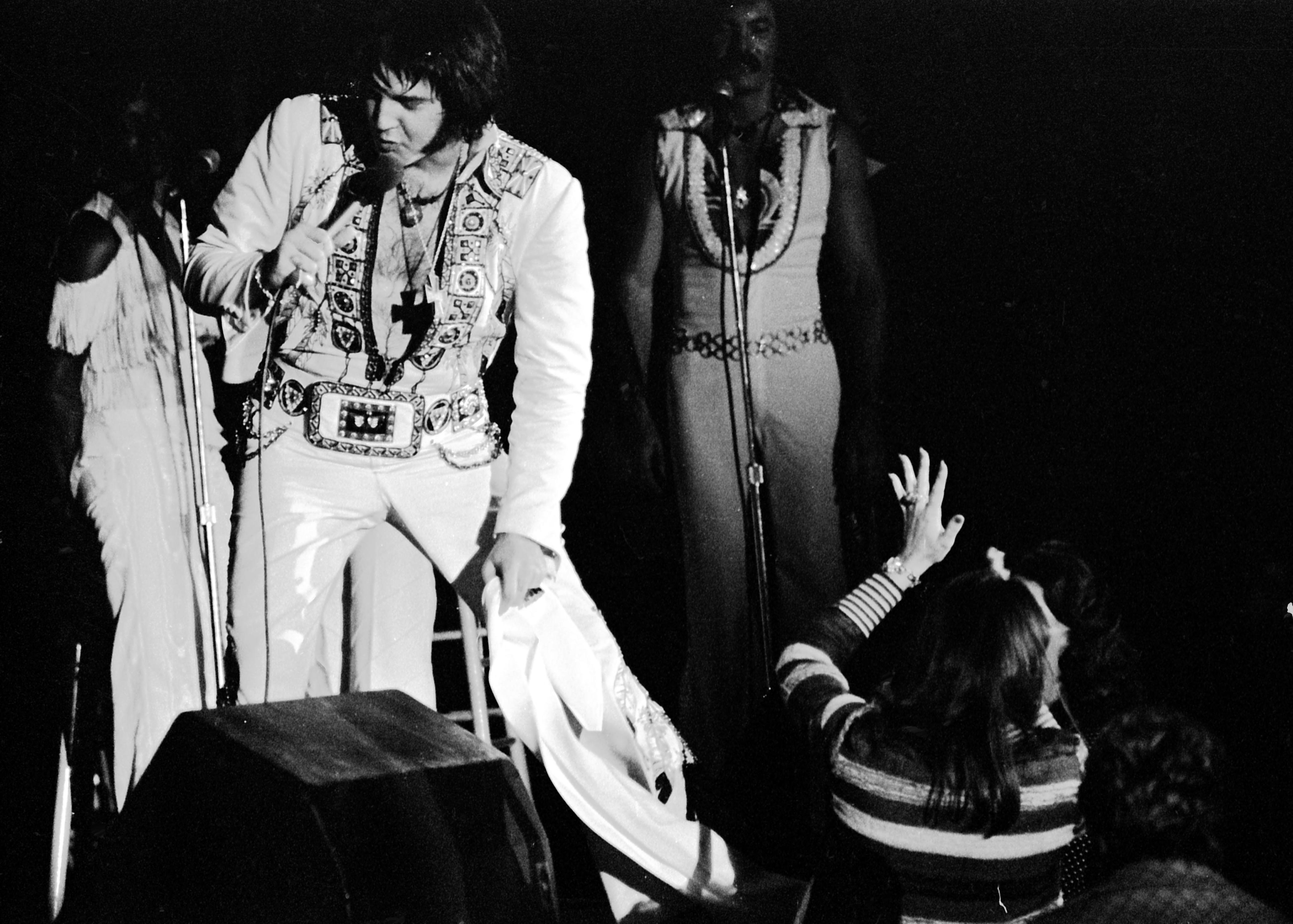 Elvis Presley in concert, tossing a scarf to fans in the audience, on October 24, 1976 at Roberts Municipal Stadium at 2600 Division St. Built in 1956, the stadium hosted concerts, circuses, basketball games, etc.; it was demolished in 2013.