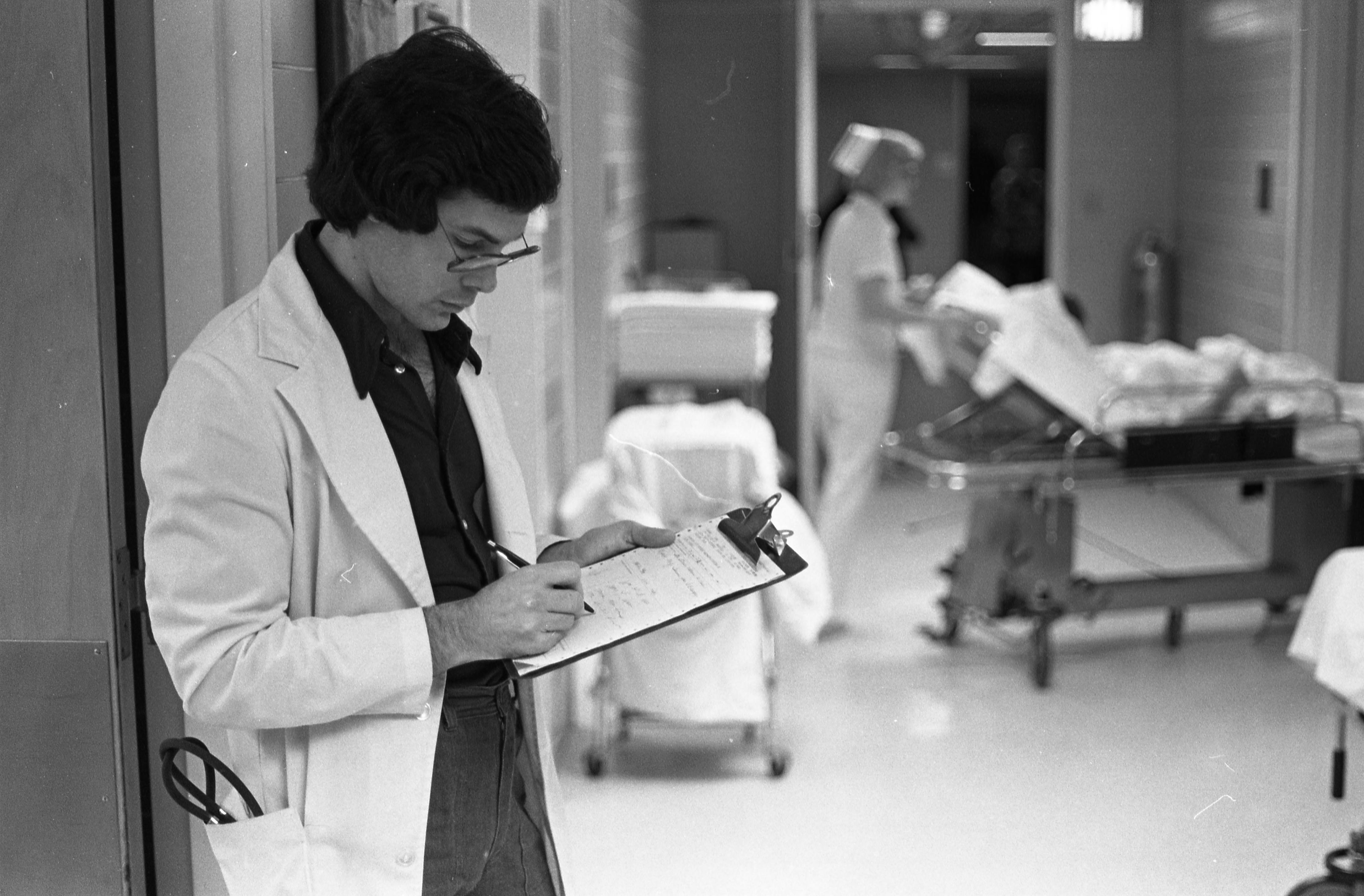 Dr. [John] Levin (first name cannot be verified), an emergency services physician, writing notes at Deaconess Hospital at 600 Mary St.