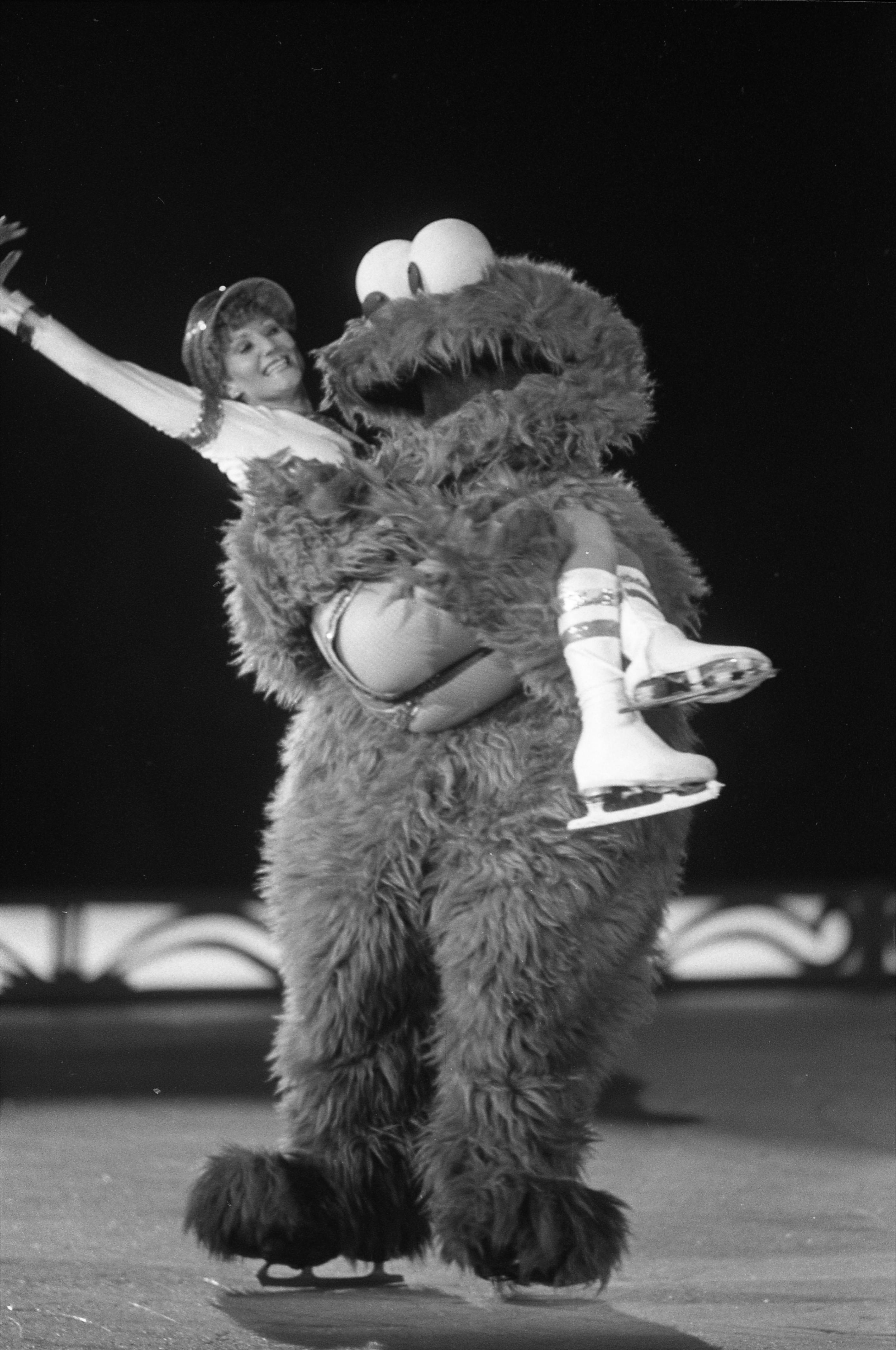 Elmo, the Sesame Street character, carrying a female skater