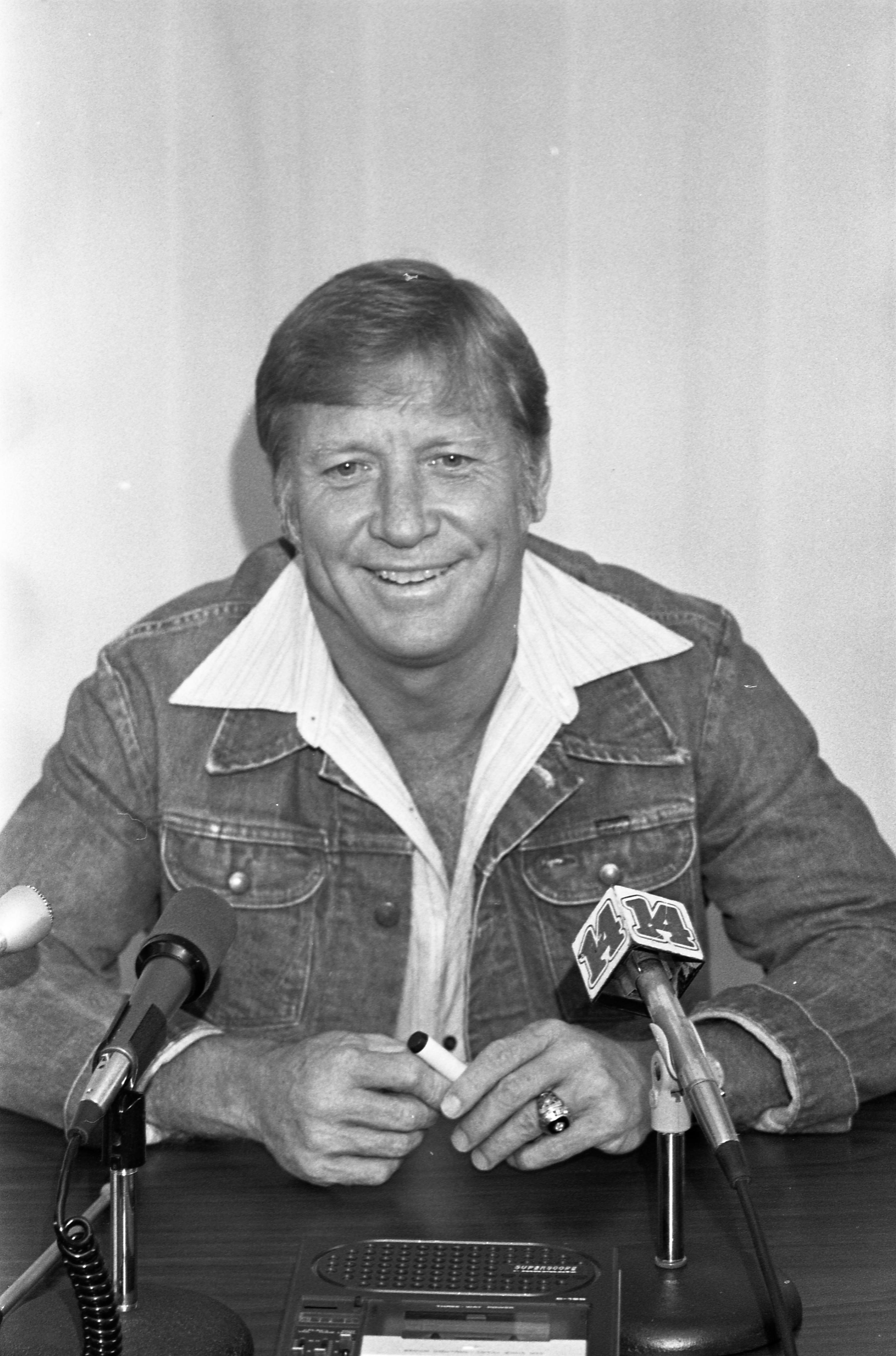 Mickey Mantle at a news conference. A microphone for WFIE, Channel 14, the NBC affiliate, is visible. He was at the Holiday Inn in Jasper as the guest speaker at an event honoring Indiana All Star baseball players, and to celebrate the new Indiana Baseball Hall of Fame.