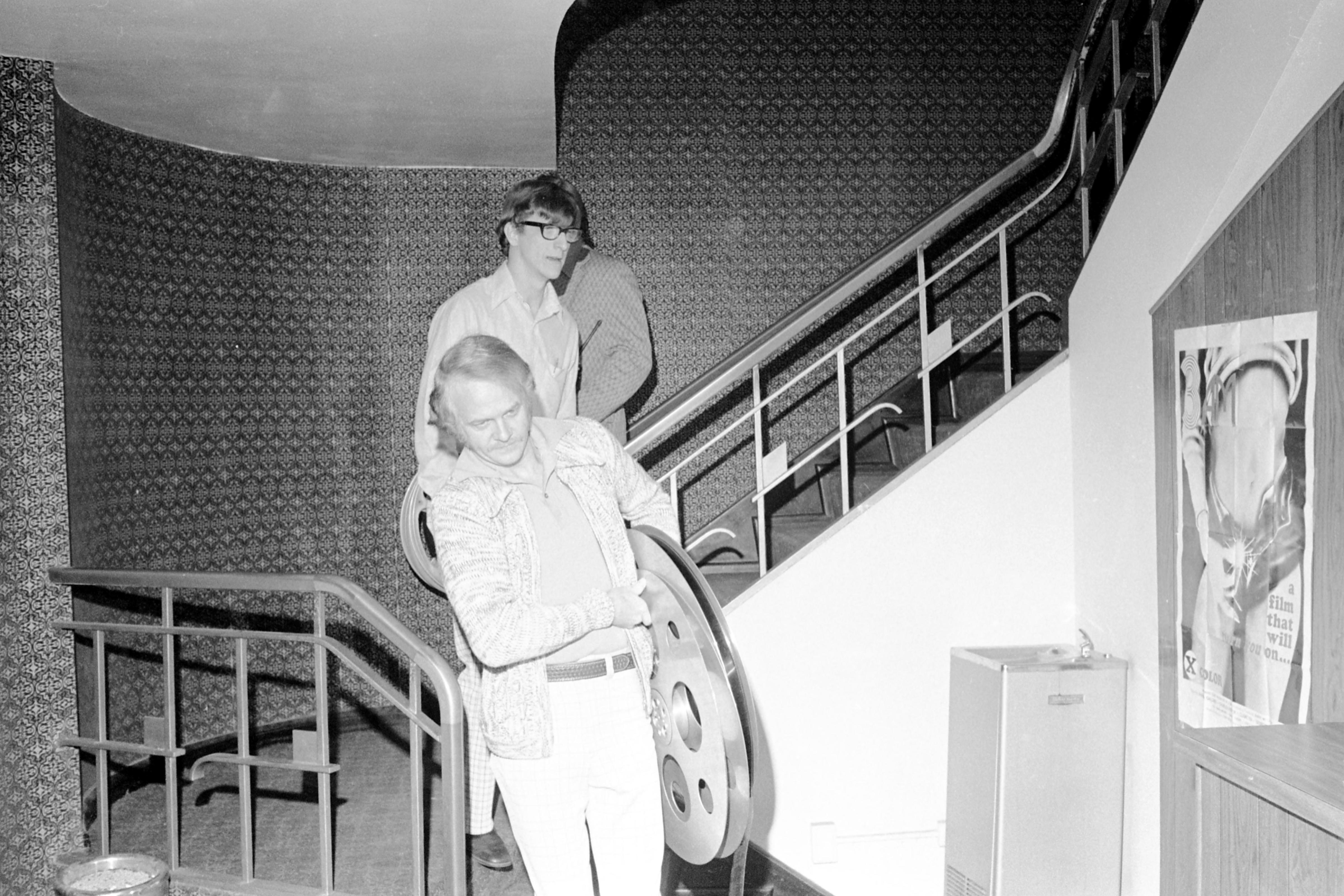 Carrying out reels of film from the Studio Art Theatre at 2113 W. Franklin St., an adult movie theater and bookstore. (Who is doing this is unclear; they are not wearing uniforms.) Built in 1908, this building housed mainstream movie theaters with various names (Palace/Franklin/West End Palace) until sometime during the 1970s when it became an adult entertainment venue. This photograph is in connection with a raid by then Vanderburgh County prosecutor William Brune in an effort to enforce an obscenity law enacted July 29, 1975. The building was razed in the 1990s.