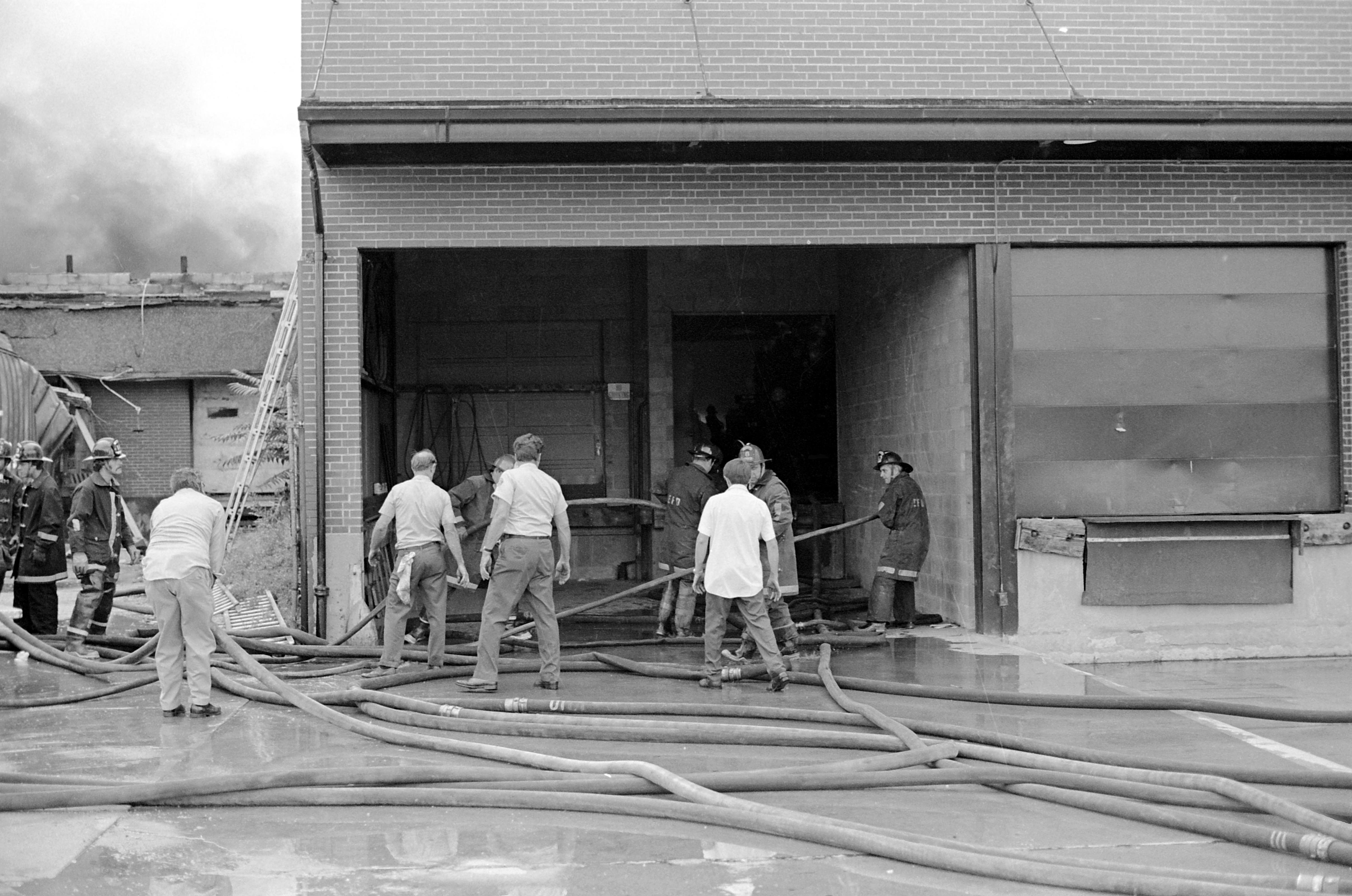 Evansville firefighters on the scene of a 3 alarm fire at A-W-D Inc. (auto parts) at 772 Division St. Given the proximity of the bystanders, the fire must be out.