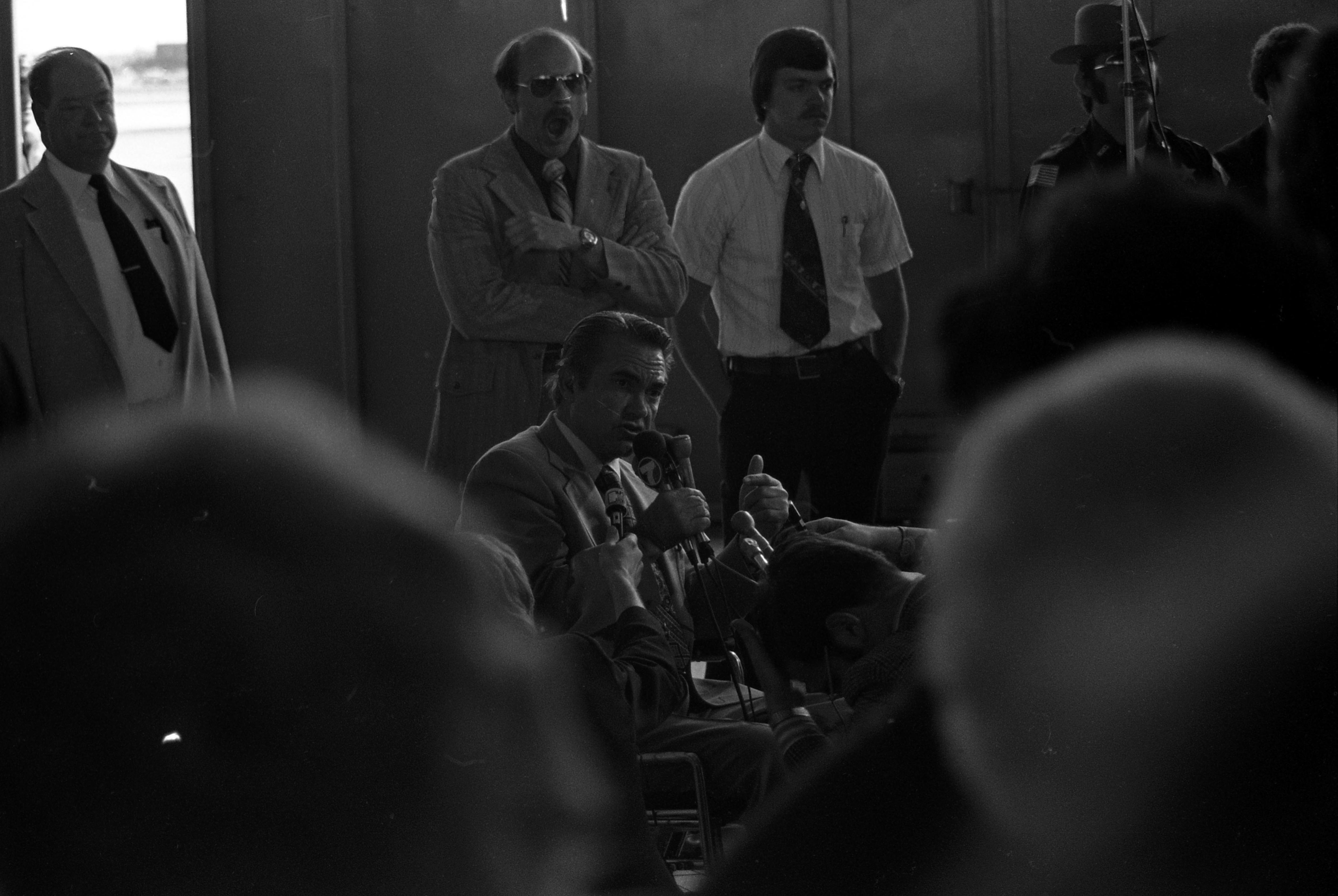 Press conference at Dress Regional Airport at U.S. Hwy. 41 North with George Wallace and microphone in the middle of the photograph, with 3 men standing behind him (possibly security) and others in front. At the time of this photograph, Wallace was in his 4th bid for the U.S. presidency, although he withdrew from that race about 2 months later. This photograph appeared in the April 23, 1976 Evansville Press, with this caption:""Though a small but enthusiastic crowd greeted Gov. George Wallace's appearance yesterday at Dress Regional Airport in Evansville, a member of Wallace's security team still produced a yawn at a news conference."