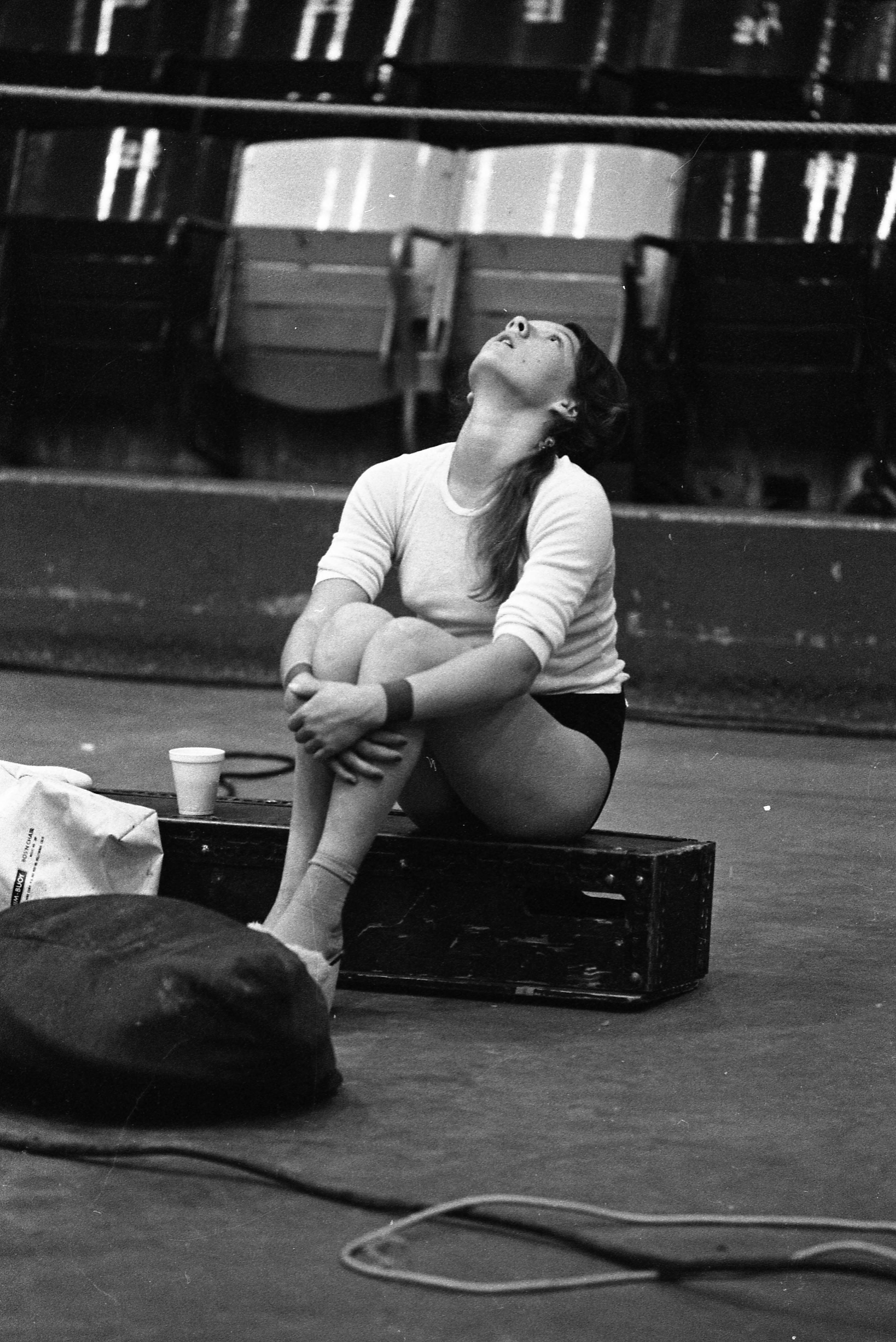 Woman sitting on ground, looking up at 2 women working acrobatic tricks on a vertical rope. This is preparatory to the Shrine Circus at Roberts Municipal Stadium at 2600 Division St. This building no longer stands.