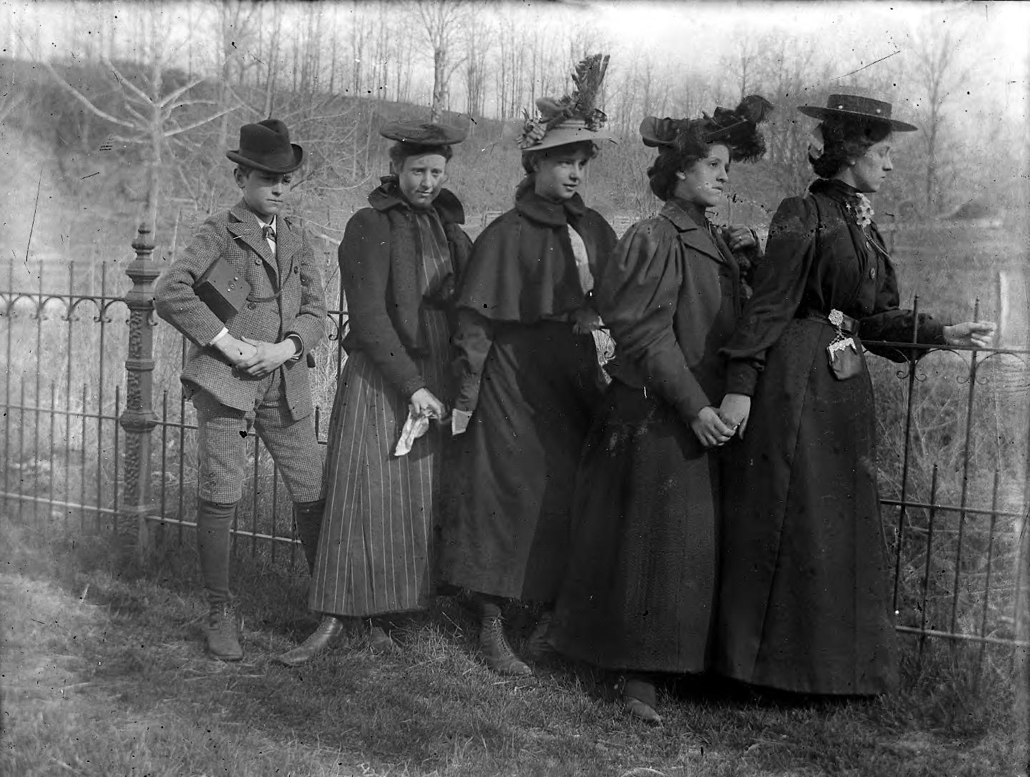 Four young women and young boy, near iron railing - Agnes Glump (2nd from left), Nellie Hargraves (2nd from right) The location is thought to be near Maple Hill Cemetery.