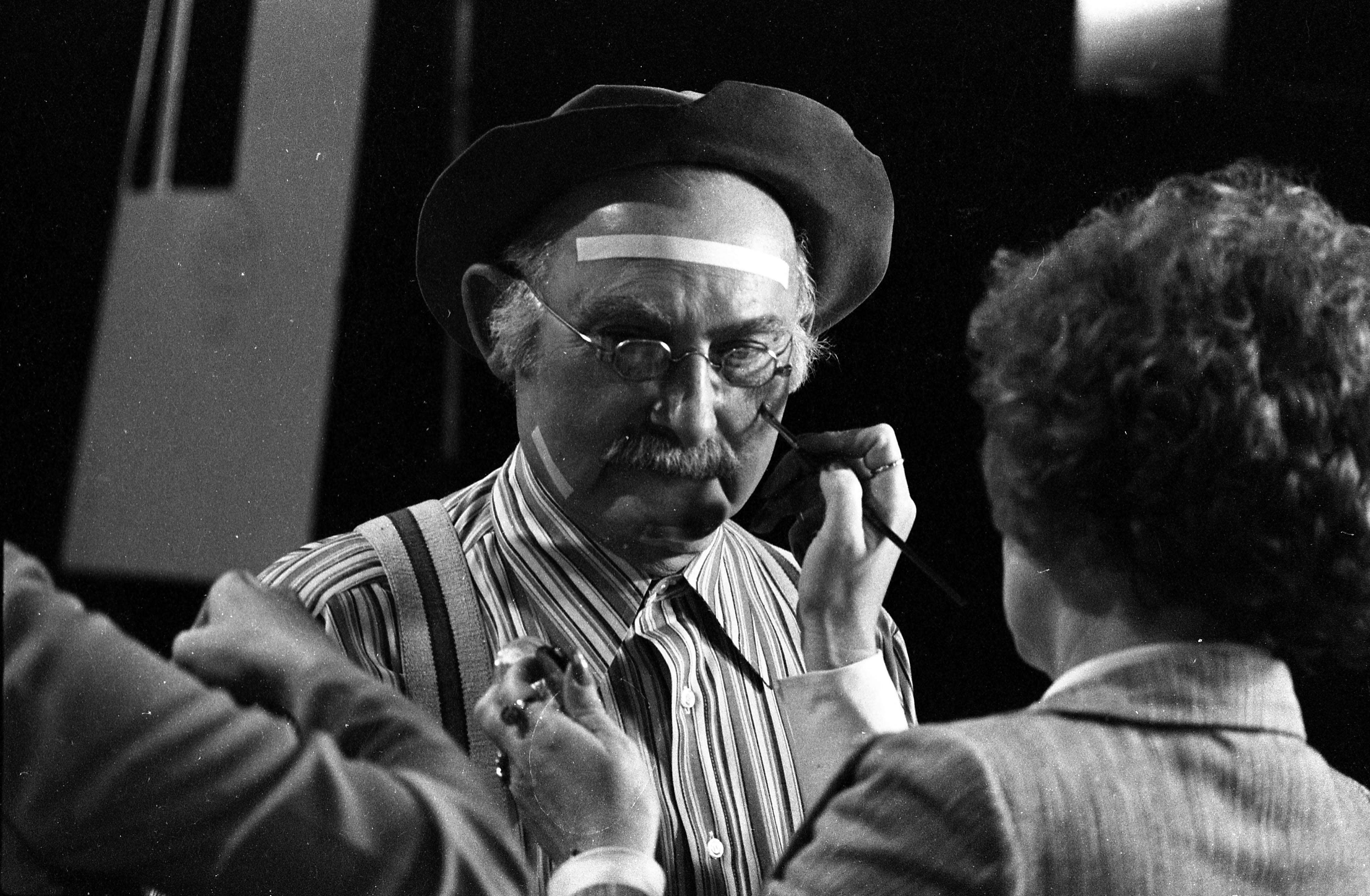 Evansville Courier photographer Sonny Brown was a friend of Hee Haw cast member Grandpa Jones, who was born in Niagara, KY (in Henderson County---just across the river from Evansville, IN) and thus was able to visit the set and take lots of backstage photographs. Here makeup artists are working on Grandpa Jones to create a head injury.