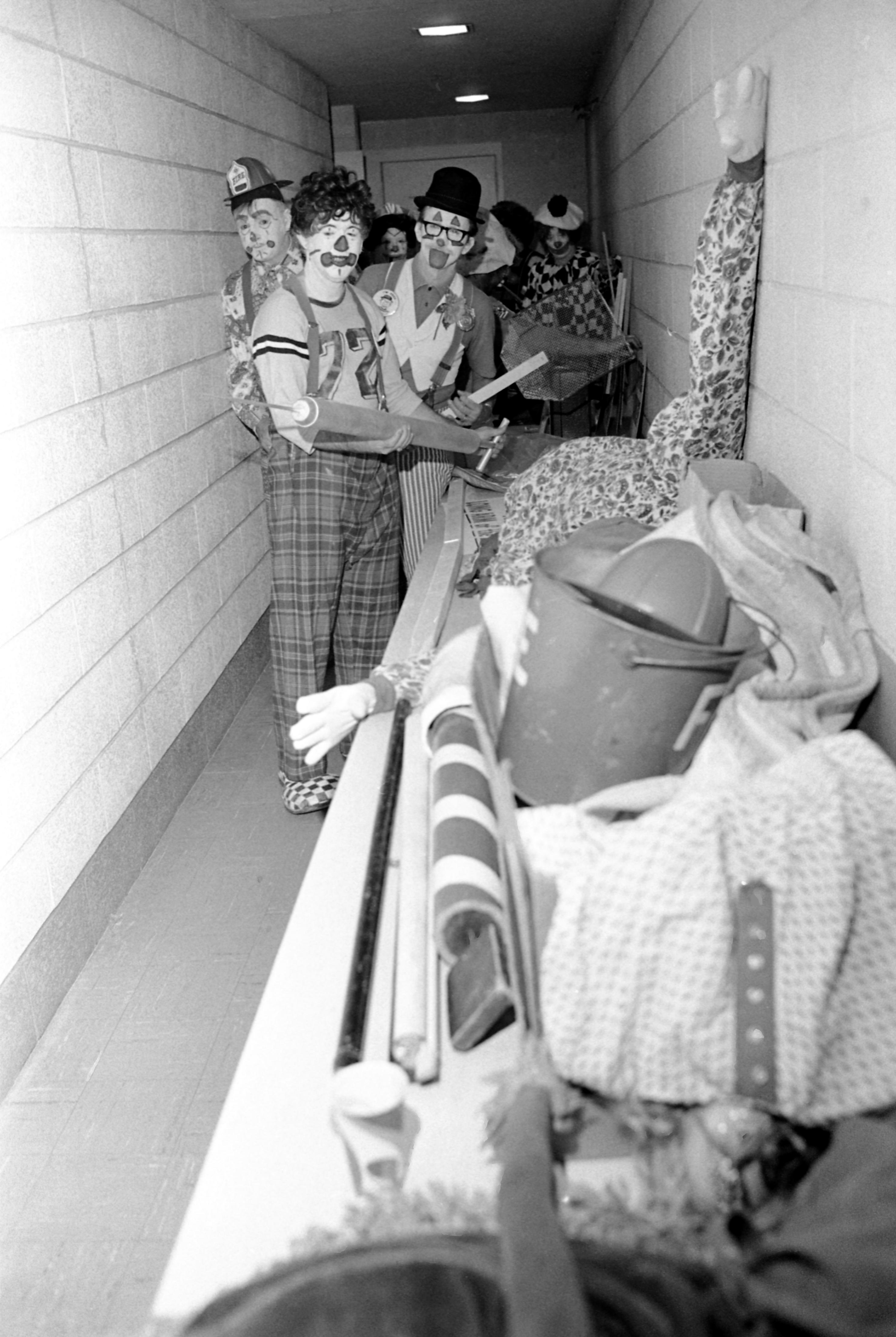 Several Hadi Shrine Circus clowns backstage in a hallway with props