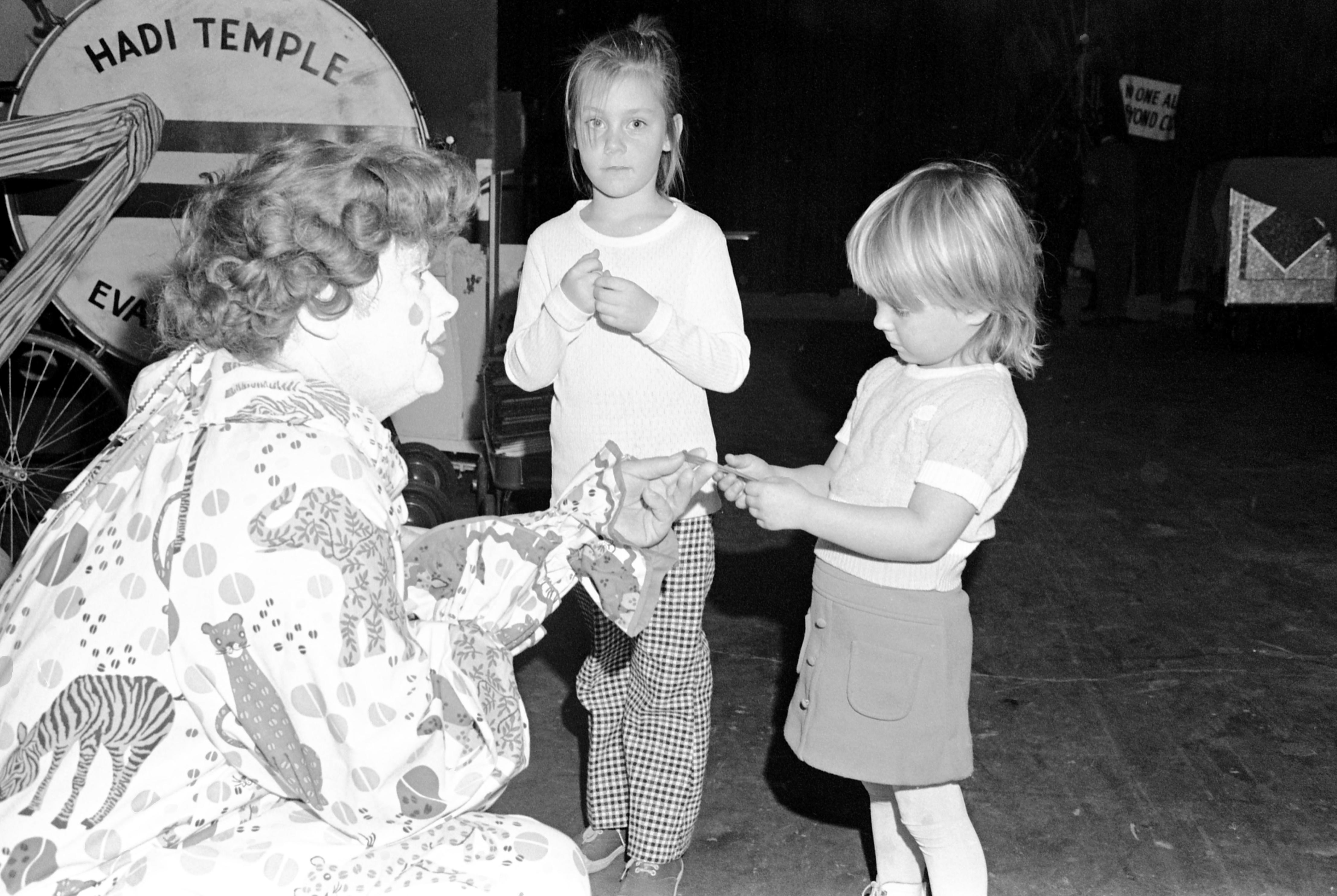 Hadi Shrine Circus talking to 2 young girls, possibly backstage, giving one an uninflated balloon