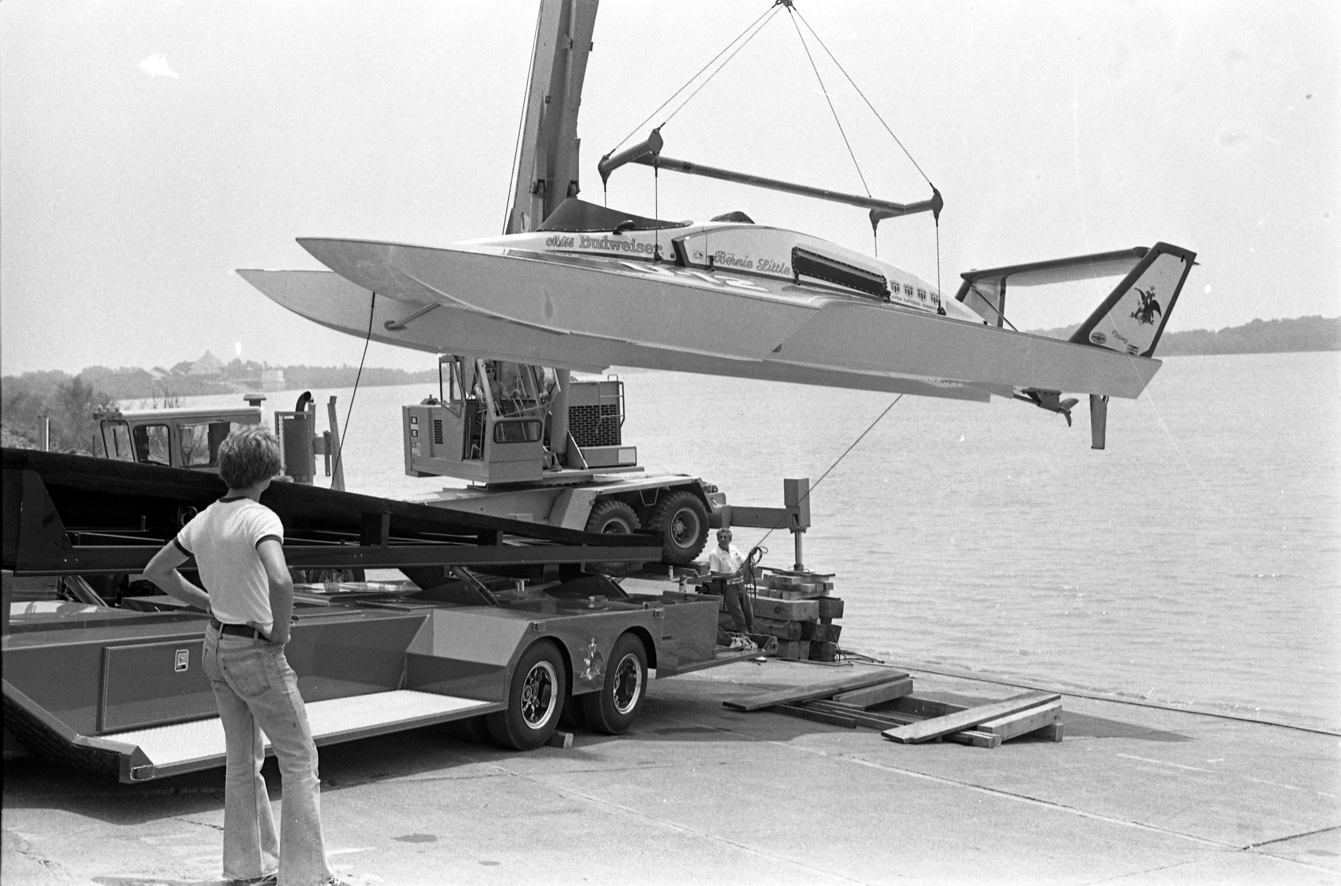 Thunder on the Ohio hydroplane races. Atlas Van Lines boat being lowered into the water.