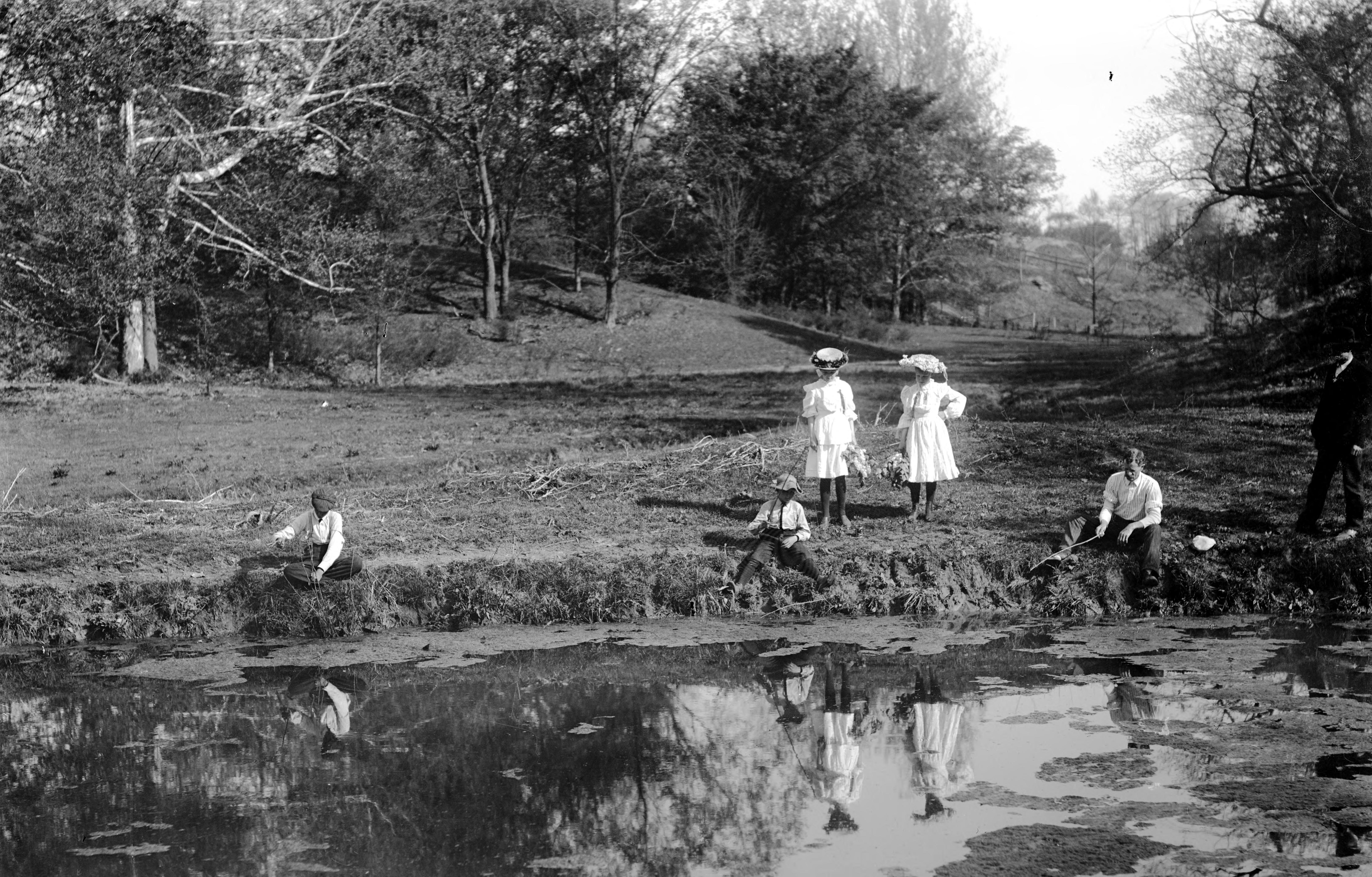 Identified as Harry Slater at Hiatt Pond. Presumably these are his children--2 sons, 2 daughters. The girls have collected flowers, the boys are fishing. There was a J.W. Hiatt who was a landscape architect in New Harmony, but whether or not this pond is associated with him is unknown.