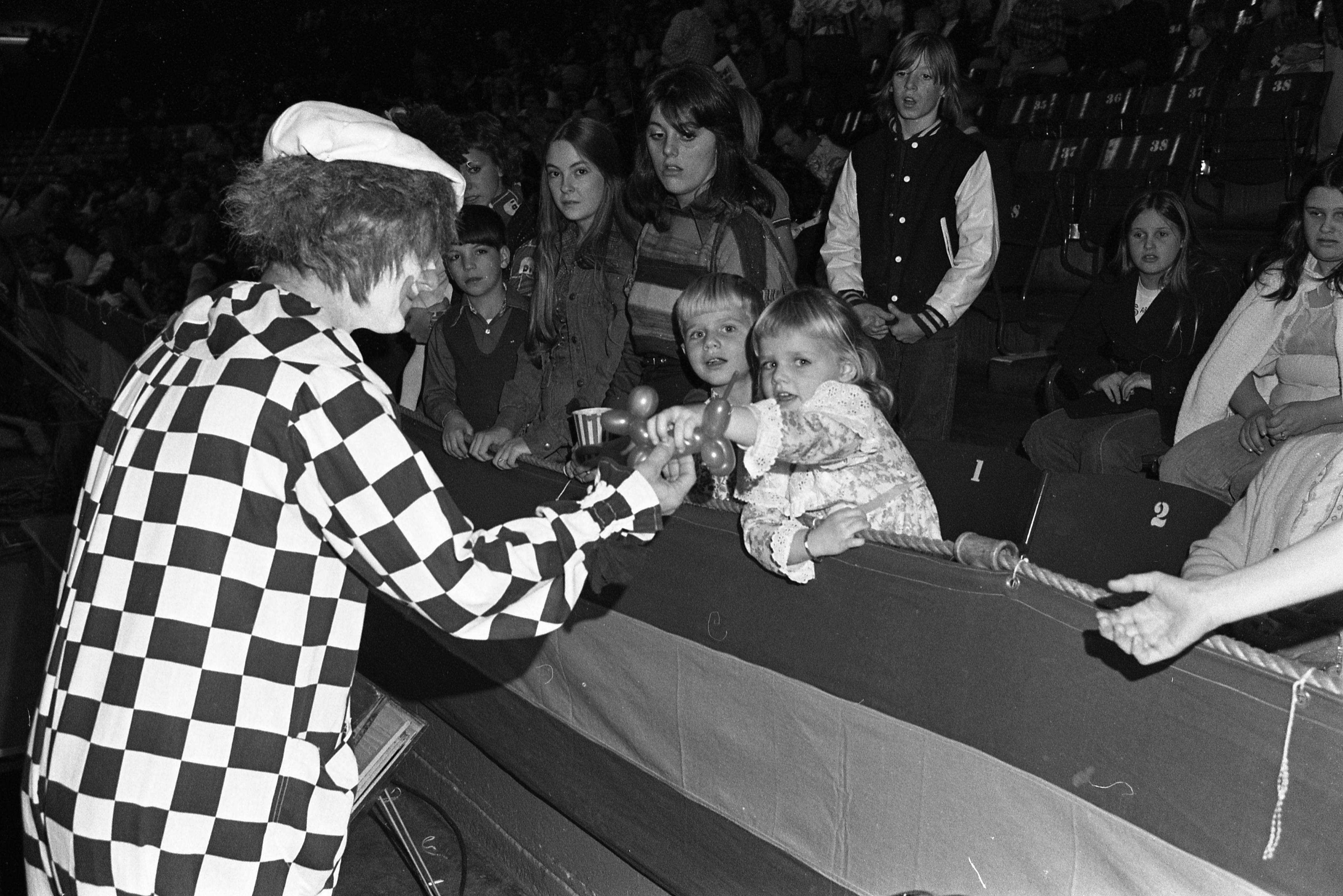 Hadi Shrine Circus clown giving a balloon animal to a girl in the audience