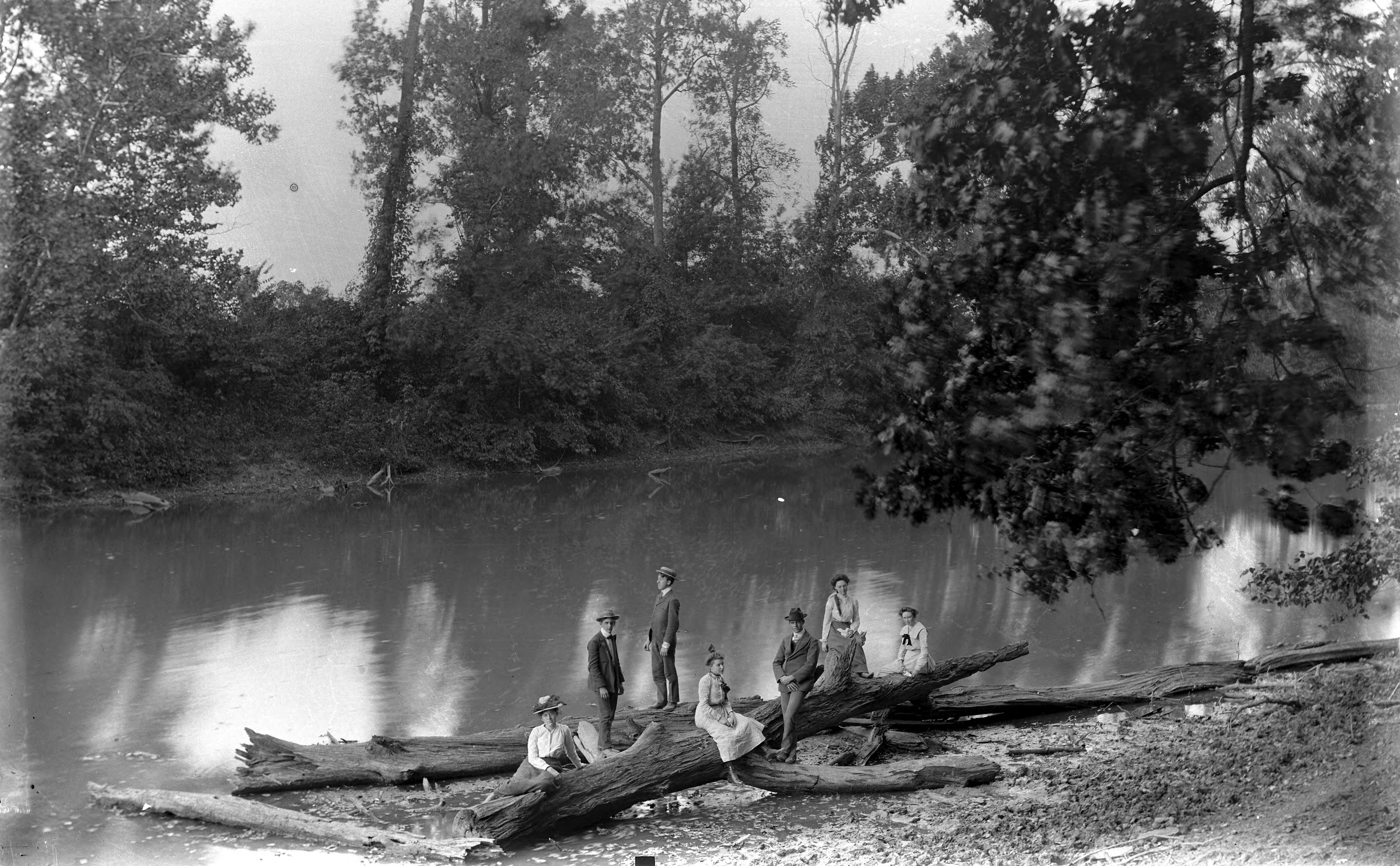 Four women and three men posing on driftwood near the Wabash River.