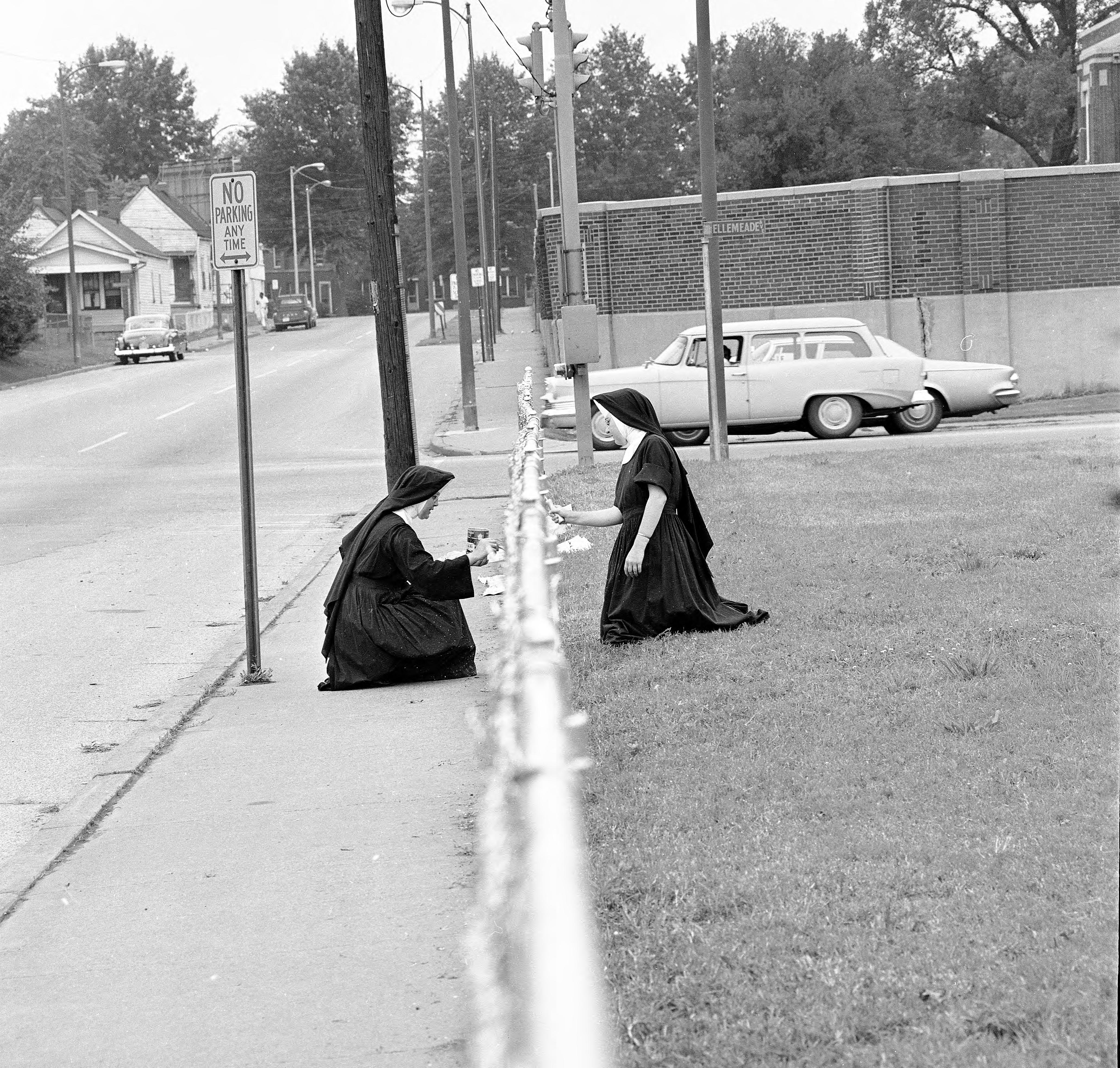 Two nuns painting a chain link fence at the corner of Bellemeade Ave. and S. Garvin St. The building across Bellemeade from them is Lincoln School at 635 Lincoln Ave. This block of Bellemeade (between S. Garvin St., seen here, and S. Morton St.) encompasses the school, church, rectory, and convent for St. John's Catholic Church, so these Sisters of Providence are painting the convent fence. Historical Note: Lincoln School, just visible beyond the wall, was the only black school in the area, and served students K-12 from 1928-1962, when it became a K-8 school. Upon court-ordered desegregation in 1972, neighborhood students were bused to other schools. Lincoln School continues in operation today.