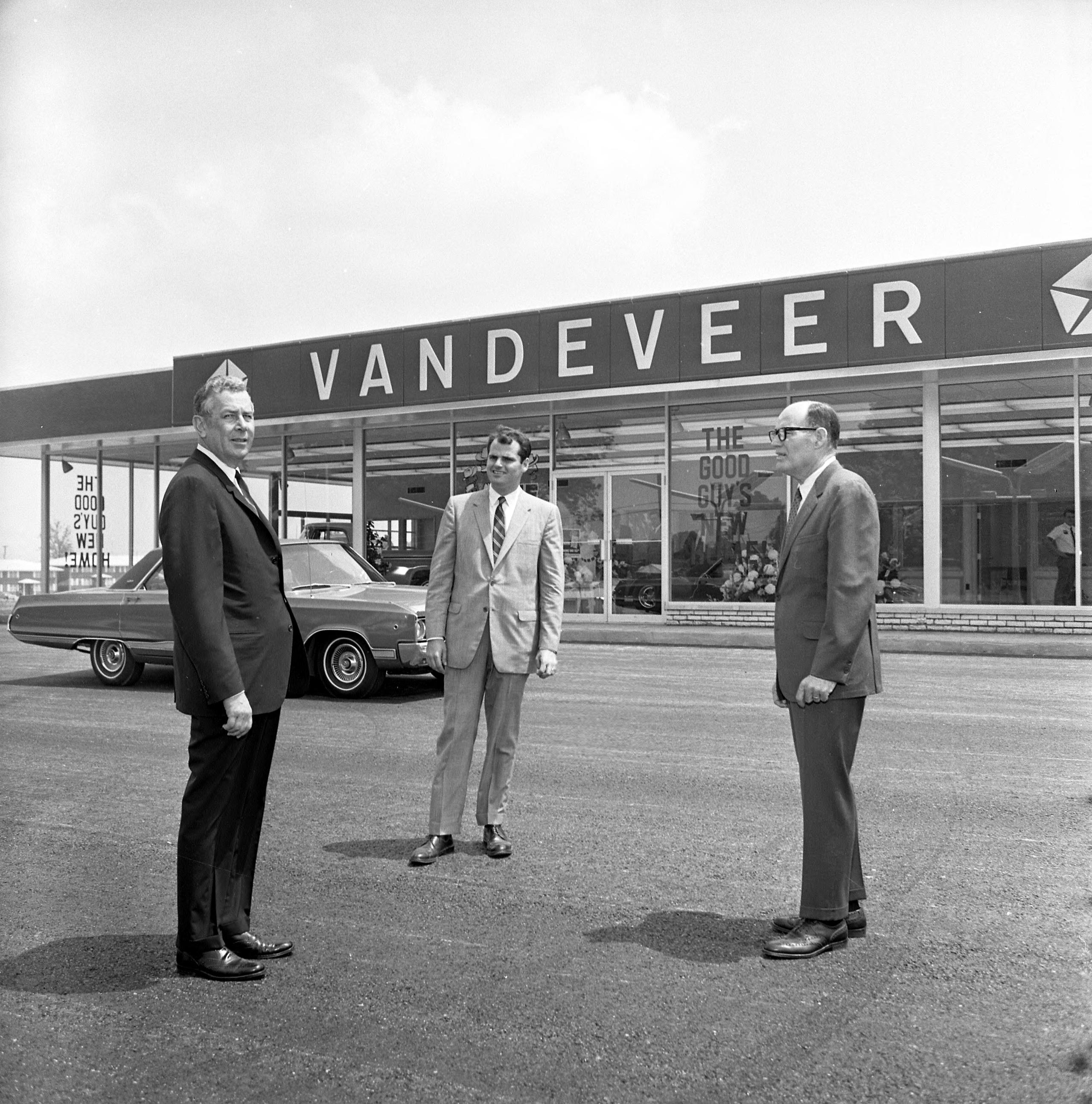 Grand opening of Vandeveer Dodge 500 S. Green River Rd. Chrysler Corp. chairman, Lynn A. Townsend (a local high school graduate) was in attendance and is thought to be the left figure in this photograph. It is possible that the rightmost man is dealership owner Dolph Vandeveer. The man in the light-colored suit is Mike Vandeveer, the owner's son.