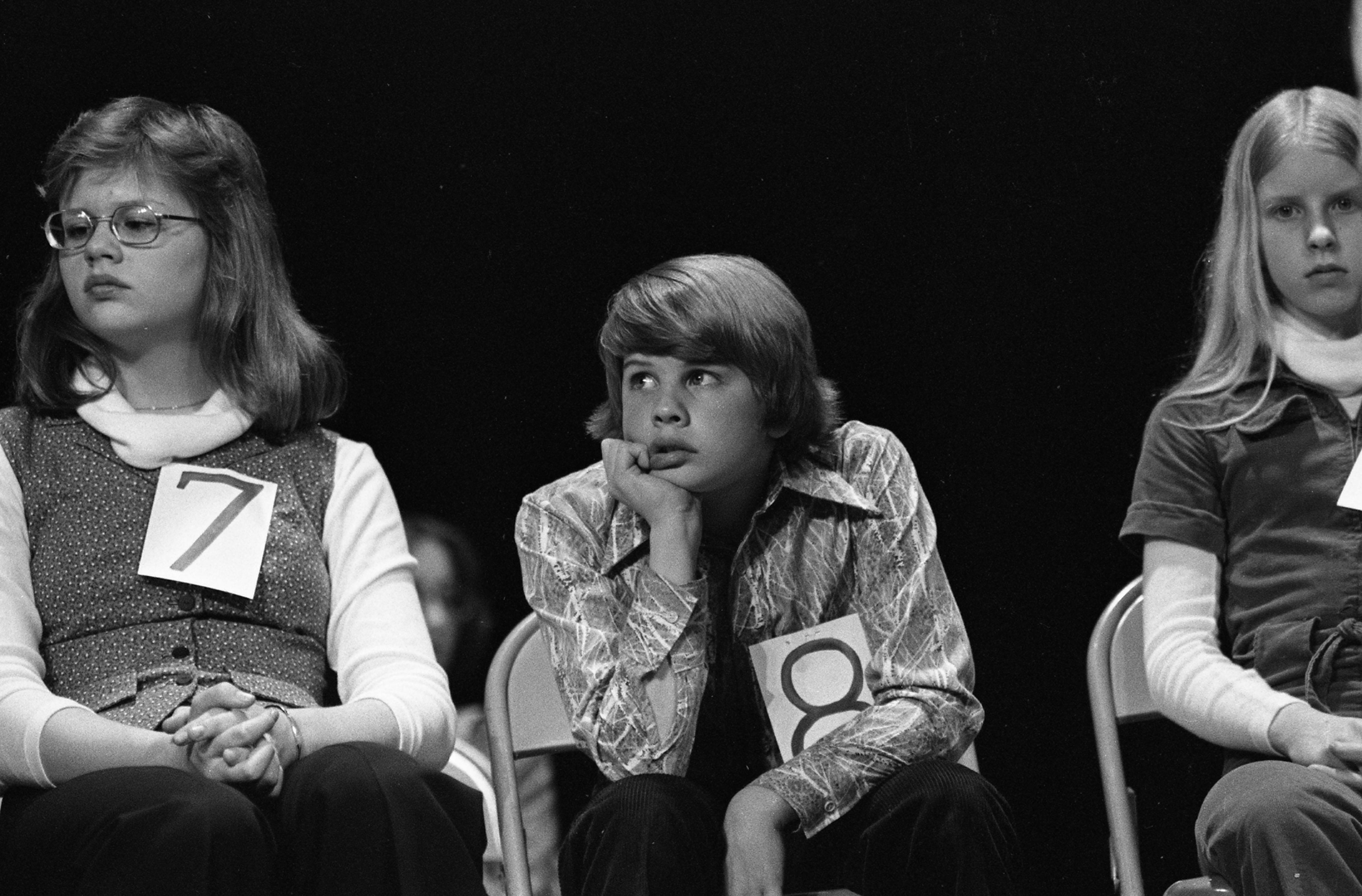 Girls and boy on stage in a spelling bee. The Evansville Press Spelling Bee was held March 16, 1978 at Central High School (5400 N. First Ave."