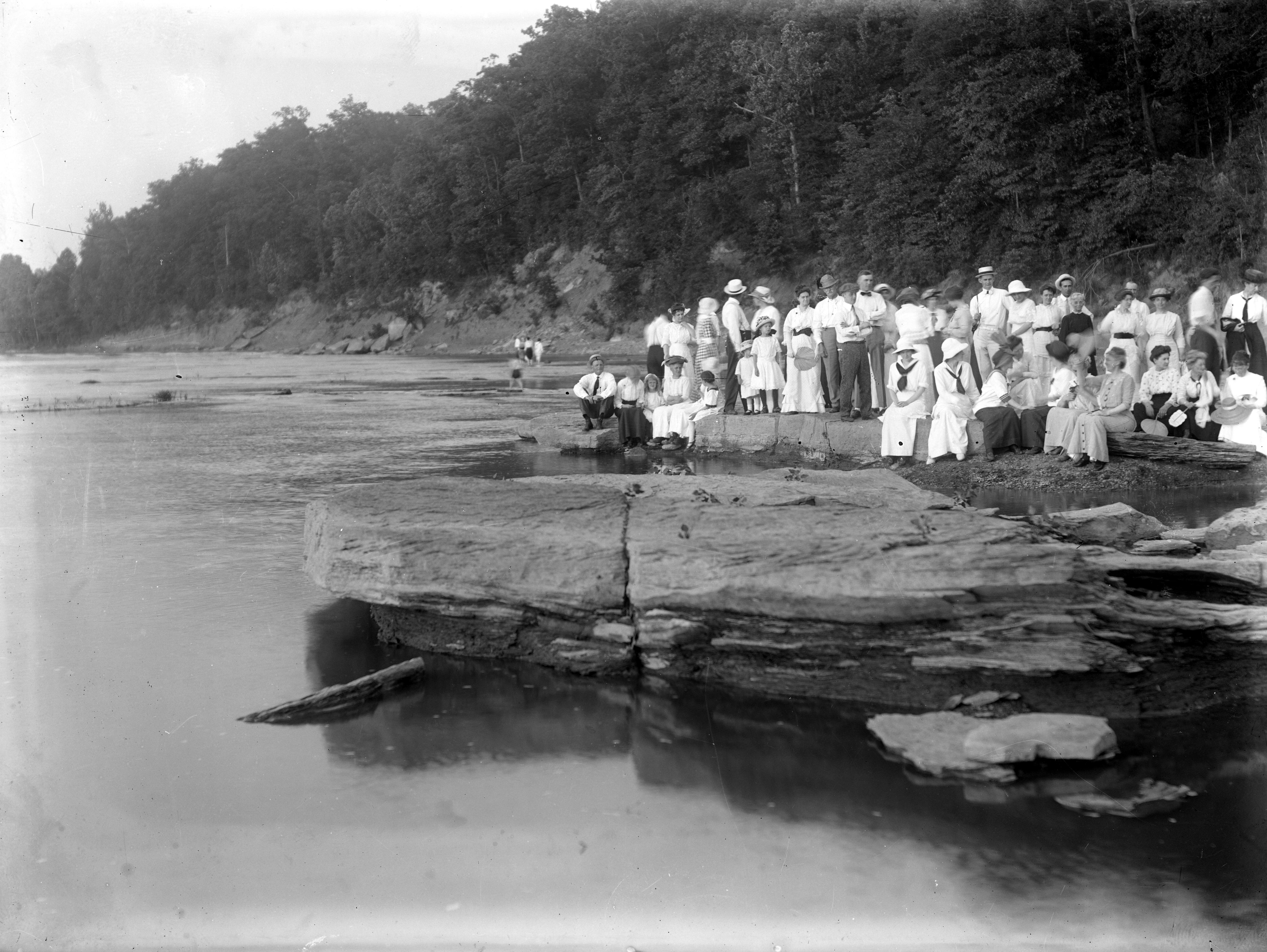 Embree family posing at the old dam on the Wabash River.""The Old Dam is a group of natural rock formations rising from the bed of the Wabash River near New Harmony. When the Wabash is low in Summer, the rocks emerge forming a series of rapids, pools, and waterfalls." (http://visitposeycounty.com/the-old-dam/).