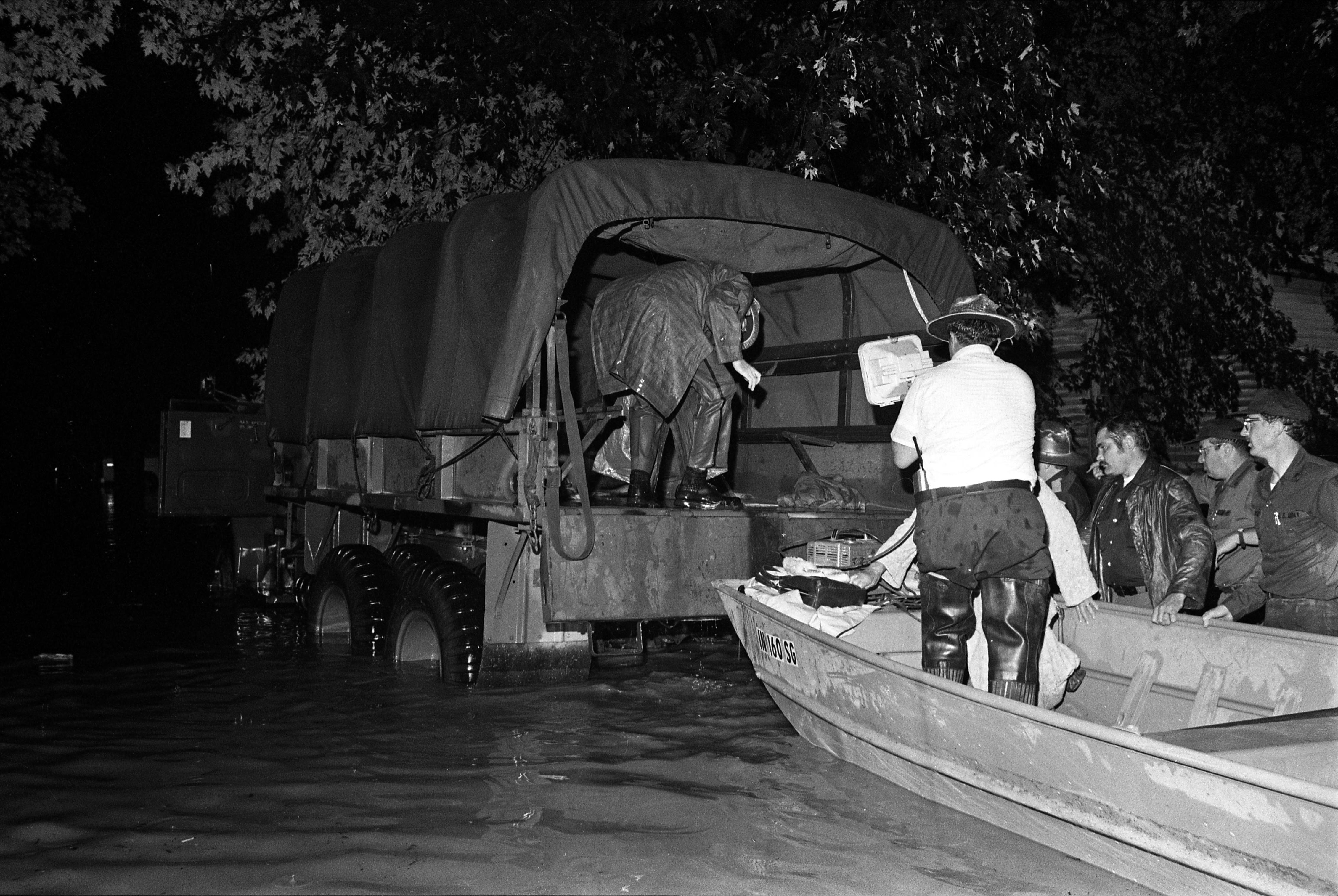 This photograph depicts the rescue of 83 year old Mrs. Myrtle Grubb from her porch on the south side of Princeton, IN by Gibson County sheriff's deputy Nick Michas. Torrential rains brought 8.9 inches of rain to Princeton over a 48 hour period, and 14.9 inches to English and Marengo, other small southern Indiana towns, causing rapid flooding. Up to 11 counties were considered disaster areas.
