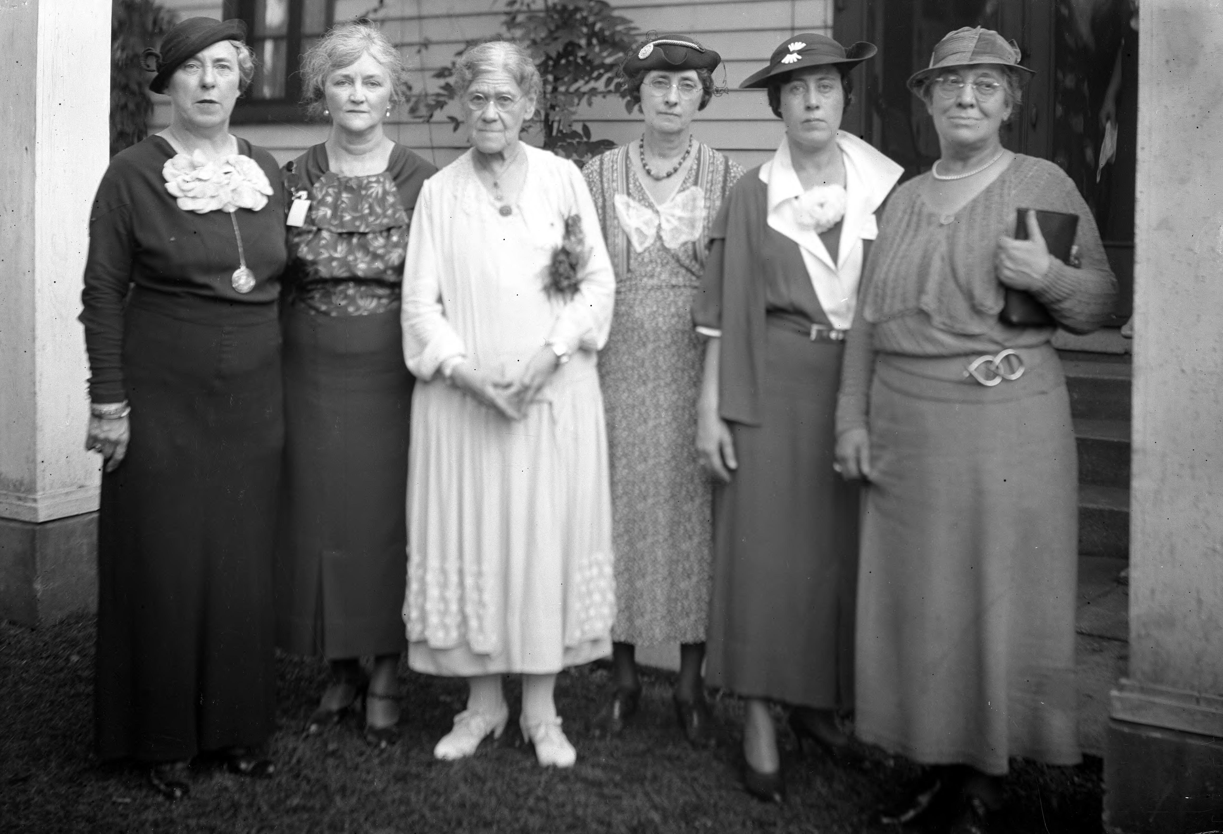 On the occasion of the Minerva Society 75th anniversary party, these women pose: Mary Emily Fauntleroy (white dress), Hattie Golden (3rd from right). The other women are not identified.