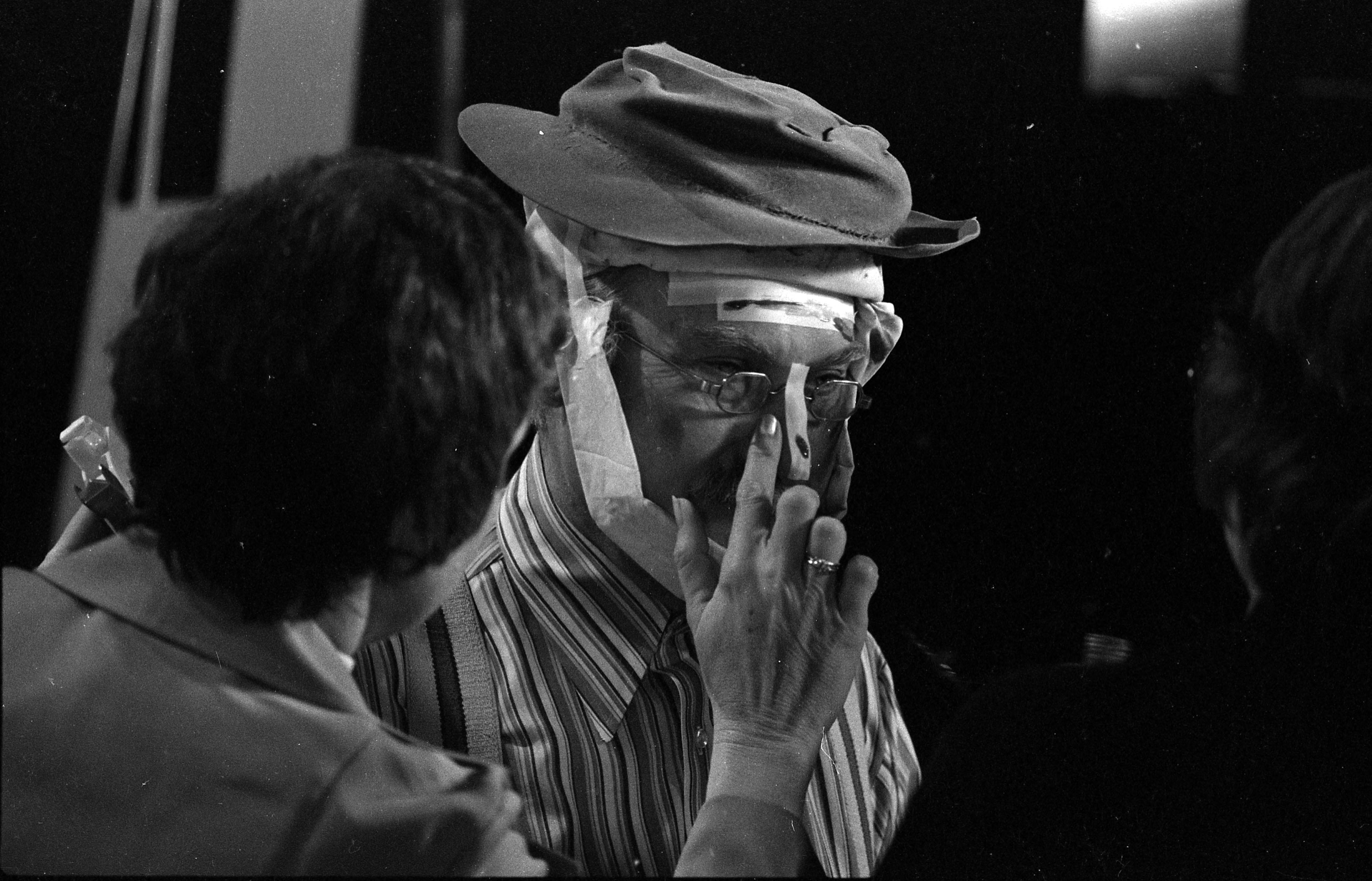 Evansville Courier photographer Sonny Brown was a friend of Hee Haw cast member Grandpa Jones, who was born in Niagara, KY (in Henderson County---just across the river from Evansville, IN) and thus was able to visit the set and take lots of backstage photographs. Here makeup artists are working on Grandpa Jones to create a head injury.
