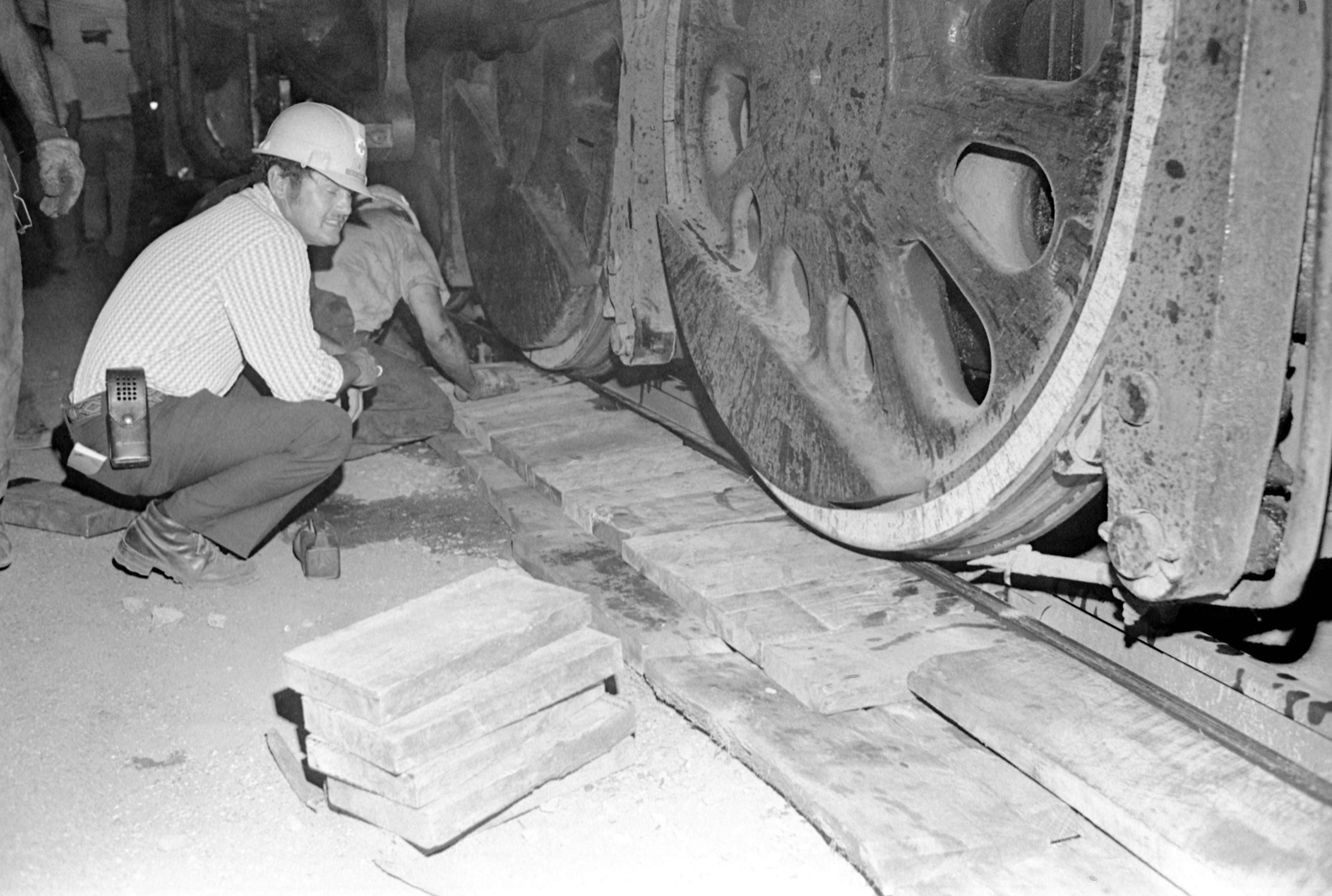 Men working on the wheels of the American Freedom Train, placing wooden blocks under part of them.""The triumph of the steam-powered American Freedom Train was, indeed, the only nationwide celebration of the Bicentennial. It was pulled by steam locomotives in the age of the diesel, and would improve on the three display cars of its predecessor, the 1947 Freedom Train. The American Freedom Train would feature twelve display cars, ten that visitors would go aboard and pass through and two to hold large objects that would be viewed from the ground through huge ""showcase"" windows. The display cars were filled with over 500 precious treasures of Americana. Included in these diverse artifacts were George Washington's copy of the Constitution, the original Louisiana Purchase, Judy Garland's dress from The Wizard of OZ, Joe Frazier's boxing trunks, Martin Luther King's pulpit and robes, and even a rock from the moon. The American Freedom Train (AFT) was a 26-car train led by one of three enormous steam engines restored just for the occasion. Over a 21 month period from April 1, 1975 to December 31, 1976 more than 7 million Americans visited the train during its tour of all 48 contiguous states. Tens of millions more stood trackside to see it go by." (http://www.freedomtrain.org/american-freedom-train-home.htm) The Freedom Train's only visit to Evansville was June 15-17, when it was parked behind the Civic Center/Vanderburgh Auditorium at 715 Locust St.