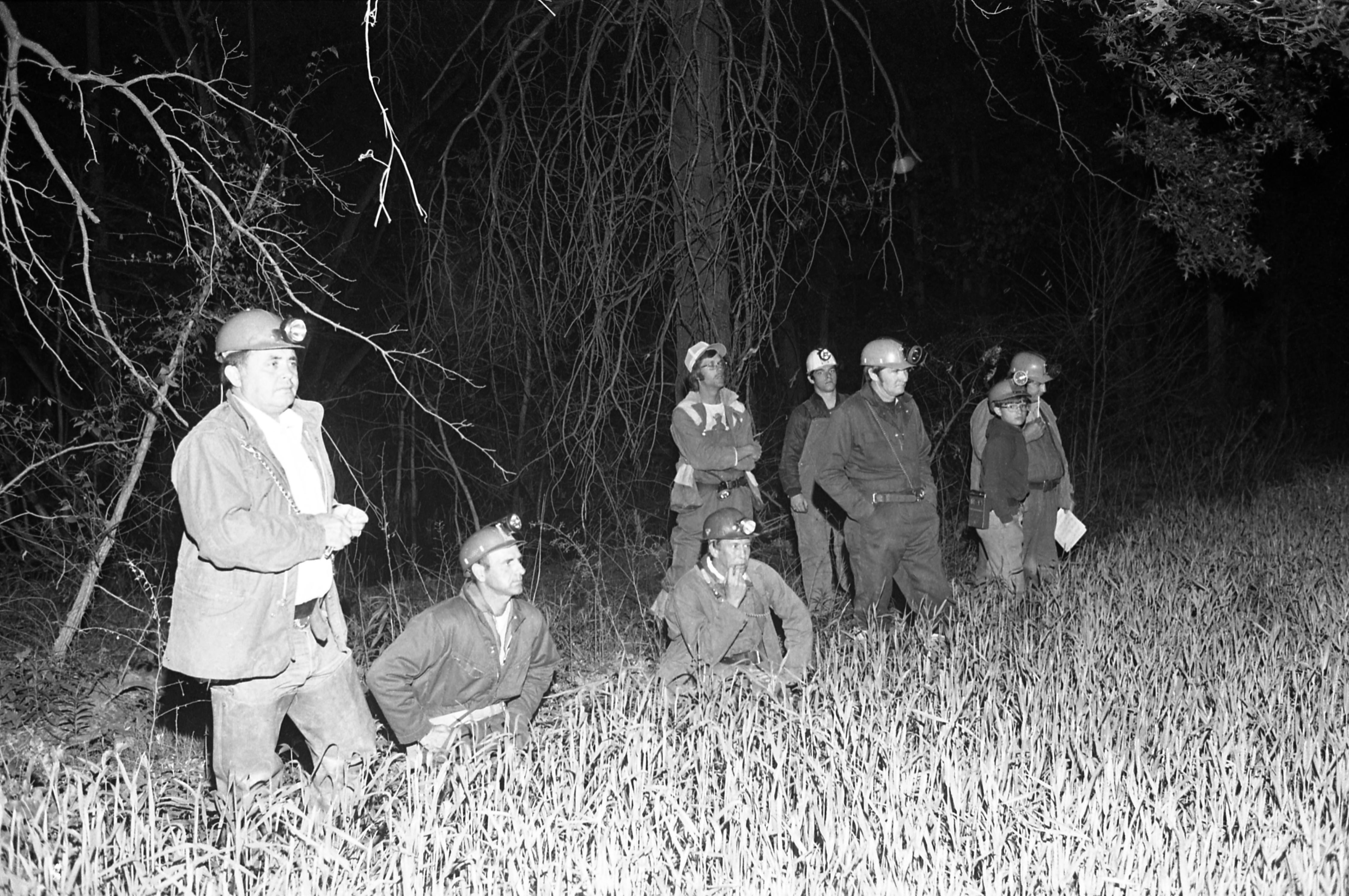 Seven men and one younger boy, most wearing headlamps, on the edge of a cornfield, ready for a search